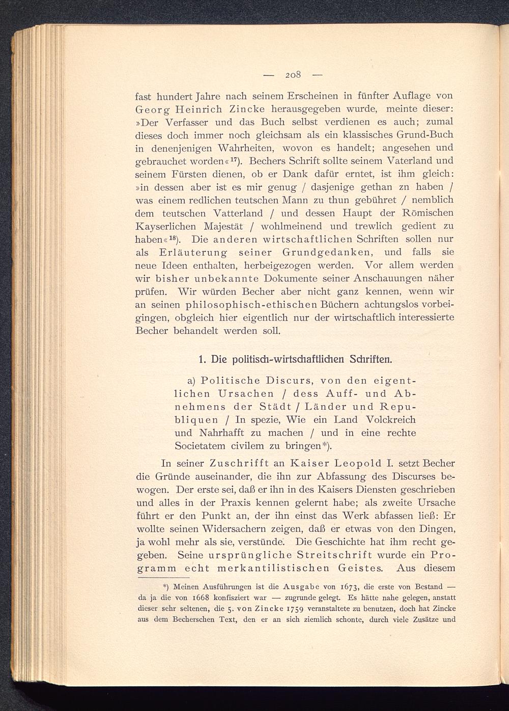 fast hundert Jahre nach seinem Erscheinen in fünfter Auflage vonGeorg Heinrich Zincke herausgegeben wurde, meinte dieser:»Der Verfasser und das Buch selbst verdienen es auch; zumaldieses doch immer noch gleichsam als ein klassisches Grund-Buchin denenjenigen Wahrheiten, wovon es handelt; angesehen undgebrauchet worden« 17 ). Bechers Schrift sollte seinem Vaterland undseinem Fürsten dienen, ob er Dank dafür erntet, ist ihm gleich:»in dessen aber ist es mir genug / dasjenige gethan zn haben /was einem redlichen teutschen Mann zu thun gebühret / nemblichdem teutschen Vatterland / und dessen Haupt der RömischenKayserlichen Majestät / wohlmeinend und trewlich gedient zuhaben« 18 ). Die anderen wirtschaftlichen Schriften sollen nurals Erläuterung seiner Grundgedanken, und falls sieneue Ideen enthalten, herbeigezogen werden. Vor allem werdenwir bisher unbekannte Dokumente seiner Anschauungen näherprüfen. Wir würden Becher aber nicht ganz kennen, wenn würan seinen philosophisch-ethischen Büchern achtungslos vorbei-gingen, obgleich hier eigentlich nur der wirtschaftlich interessierteBecher behandelt werden soll.