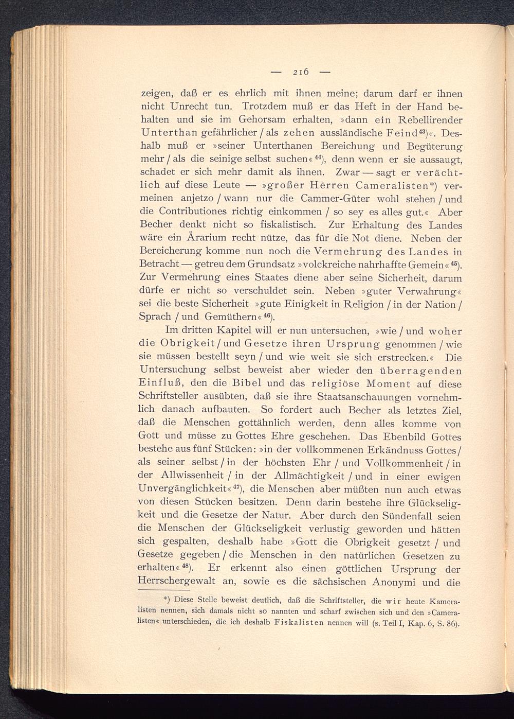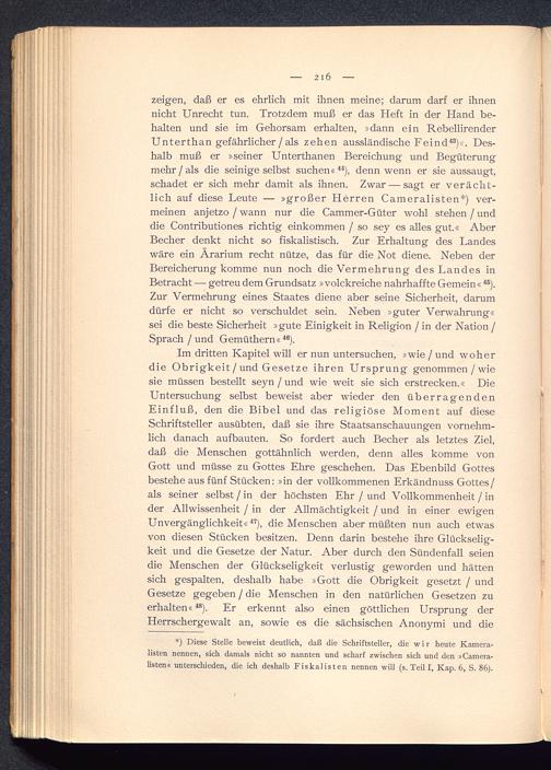 zeigen, daß er es ehrlich mit ihnen meine; darum darf er ihnennicht Unrecht tun. Trotzdem muß er das Heft in der Hand be-halten und sie im Gehorsam erhalten, »dann ein RebellirenderUnterthan gefährlicher / als zehen aussländische Feind 43 )«. Des-halb muß er »seiner Unterthanen Bereichung und Begüterungmehr / als die seinige selbst suchen« 44 ), denn wenn er sie aussaugt,schadet er sich mehr damit als ihnen. Zwar — sagt er verächt-lich auf diese Leute — »großer Herren Cameralisten*) ver-meinen anjetzo / wann nur die Cammer-Güter wohl stehen / unddie Contributiones richtig einkommen / so sey es alles gut.« AberBecher denkt nicht so fiskalistisch. Zur Erhaltung des Landeswäre ein Ärarium recht nütze, das für die Not diene. Neben derBereicherung komme nun noch die Vermehrung des Landes inBetracht — getreu dem Grundsatz »volckreiche nahrhaffte Gemein « 45 ).Zur Vermehrung eines Staates diene aber seine Sicherheit, darumdürfe er nicht so verschuldet sein. Neben »guter Verwahrung«sei die beste Sicherheit »gute Einigkeit in Religion / in der Nation /Sprach / und Gemüthern« 46 ).