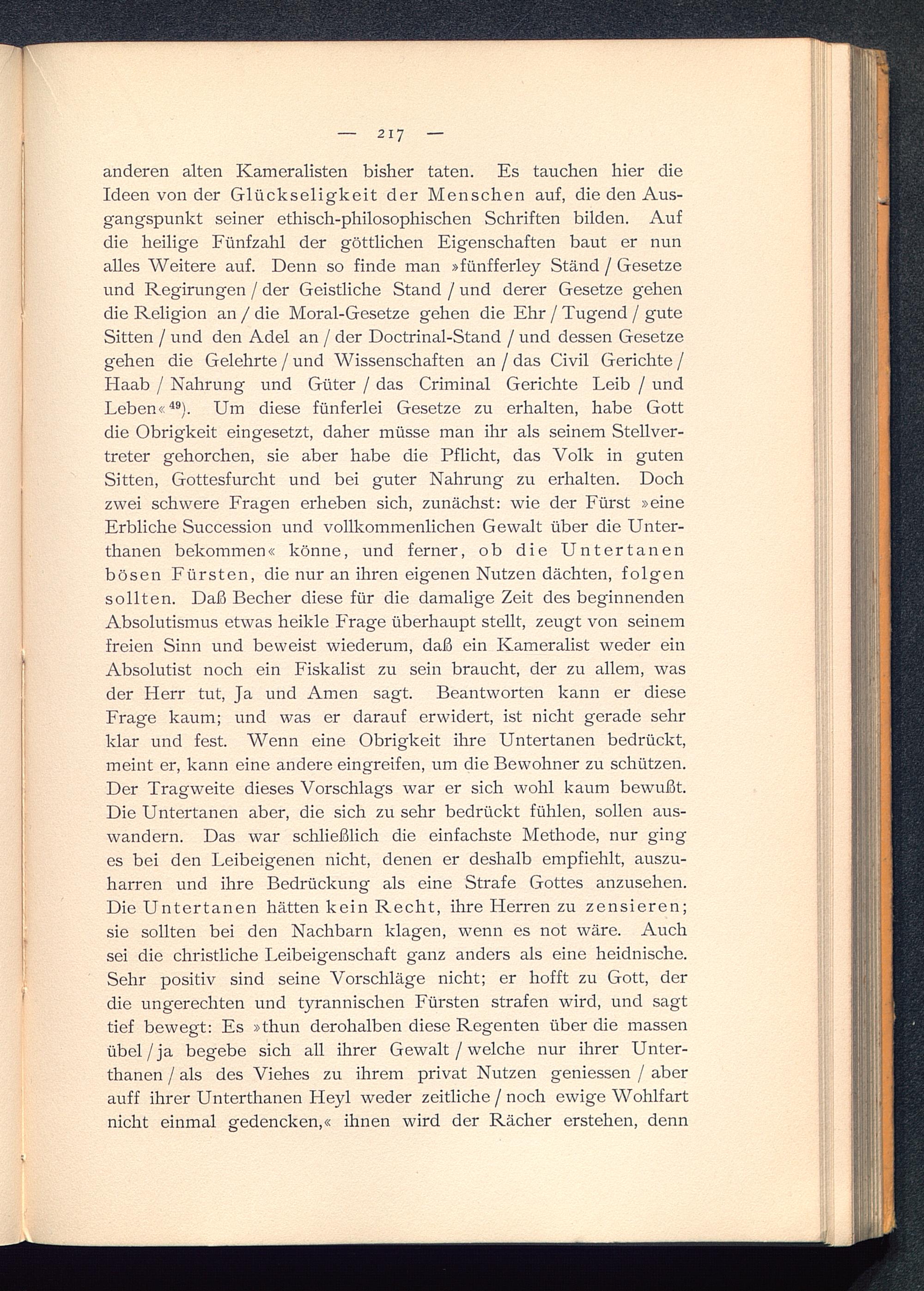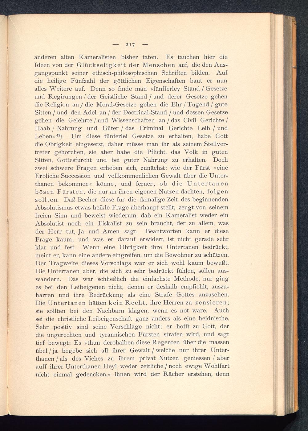 anderen alten Kameralisten bisher taten. Es tauchen hier dieIdeen von der Glückseligkeit der Menschen auf, die den Aus-gangspunkt seiner ethisch-philosophischen Schriften bilden. Aufdie heilige Fünfzahl der göttlichen Eigenschaften baut er nunalles Weitere auf. Denn so finde man »fünfferley Stand / Gesetzeund Regirungen / der Geistliche Stand / und derer Gesetze gehendie Religion an / die Moral-Gesetze gehen die Ehr / Tugend / guteSitten / und den Adel an / der Doctrinal-Stand / und dessen Gesetzegehen die Gelehrte / und Wissenschaften an / das Civil Gerichte /Haab / Nahrung und Güter / das Criminal Gerichte Leib / undLeben« 49 ). Um diese fünferlei Gesetze zu erhalten, habe Gott die Obrigkeit eingesetzt, daher müsse man ihr als seinem Stellver-treter gehorchen, sie aber habe die Pflicht, das Volk in gutenSitten, Gottesfurcht und bei guter Nahrung zu erhalten. Dochzwei schwere Fragen erheben sich, zunächst: wie der Fürst »eineErbliche Succession und vollkommenlichen Gewalt über die Unter-thanen bekommen« könne, und ferner, ob die Untertanenbösen Fürsten, die nur an ihren eigenen Nutzen dächten, folgensollten. Daß Becher diese für die damalige Zeit des beginnendenAbsolutismus etwas heikle Frage überhaupt stellt, zeugt von seinemfreien Sinn und beweist wiederum, daß ein Kameralist weder einAbsolutist noch ein Fiskalist zu sein braucht, der zu allem, wasder Herr tut, Ja und Amen sagt. Beantworten kann er dieseFrage kaum; und was er darauf erwidert, ist nicht gerade sehrklar und fest. Wenn eine Obrigkeit ihre Untertanen bedrückt,meint er, kann eine andere eingreifen, um die Bewohner zu schützen.Der Tragweite dieses Vorschlags war er sich wohl kaum bewußt.Die Untertanen aber, die sich zu sehr bedrückt fühlen, sollen aus-wandern. Das war schließlich die einfachste Methode, nur ginges bei den Leibeigenen nicht, denen er deshalb empfiehlt, auszu-harren und ihre Bedrückung als eine Strafe Gottes anzusehen.Die Untertanen hätten kein Recht, ihre Herren zu zensieren;sie sollten bei den Nachbarn klagen, wenn es not wäre. Auchsei die christliche Leibeigenschaft ganz anders als eine heidnische.Sehr positiv sind seine Vorschläge nicht; er hofft zu Gott, derdie ungerechten und tyrannischen Fürsten strafen wird, und sagttief bewegt: Es »thun derohalben diese Regenten über die massenübel /ja begebe sich all ihrer Gewalt / welche nur ihrer Unter-thanen / als des Viehes zu ihrem privat Nutzen geniessen / aberauff ihrer Unterthanen Heyl weder zeitliche / noch ewige Wohlfartnicht einmal gedencken,« ihnen wird der Rächer erstehen, denn