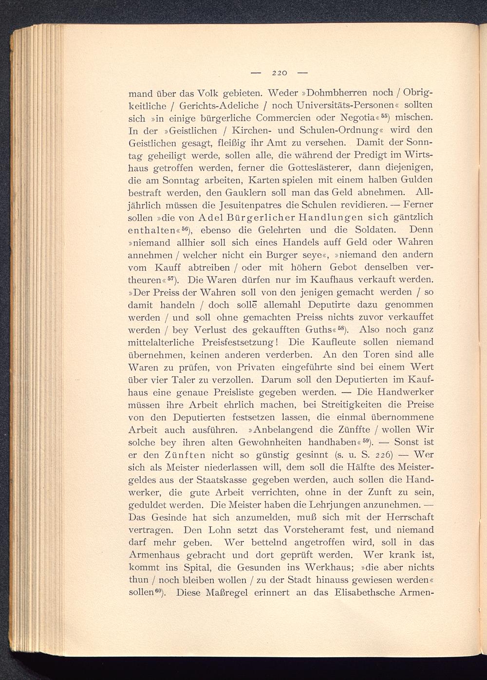 mand über das Volk gebieten. Weder »Dohmbherren noch / Obrig-keitliche / Gerichts-Adeliche / noch Universitäts-Personen« solltensich »in einige bürgerliche Commercien oder Negotia« 85 ) mischen.In der »Geistlichen / Kirchen- und Schulen-Ordnung« wird denGeistlichen gesagt, fleißig ihr Amt zu versehen. Damit der Sonn-tag geheiligt werde, sollen alle, die während der Predigt im Wirts-haus getroffen werden, ferner die Gotteslästerer, dann diejenigen,die am Sonntag arbeiten, Karten spielen mit einem halben Guldenbestraft werden, den Gauklern soll man das Geld abnehmen. All-jährlich müssen die Jesuitenpatres die Schulen revidieren. — Fernersollen »die von Adel Bürgerlicher Handlungen sich gäntzlichenthalten« 56 ), ebenso die Gelehrten und die Soldaten. Denn»niemand allhier soll sich eines Handels auff Geld oder Wahrenannehmen / welcher nicht ein Burger seye«, »niemand den andernvom Kauff abtreiben / oder mit höhern Gebot denselben ver-theuren« 57 ). Die Waren dürfen nur im Kaufhaus verkauft werden.»Der Preiss der Wahren soll von den jenigen gemacht werden / sodamit handeln / doch solle allemahl Deputirte dazu genommenwerden / und soll ohne gemachten Preiss nichts zuvor verkauftetwerden / bey Verlust des gekaufften Guths« 68 ). Also noch ganzmittelalterliche Preisfestsetzung! Die Kaufleute sollen niemandübernehmen, keinen anderen verderben. An den Toren sind alleWaren zu prüfen, von Privaten eingeführte sind bei einem Wertüber vier Taler zu verzollen. Darum soll den Deputierten im Kauf-haus eine genaue Preisliste gegeben werden. — Die Plandwerkermüssen ihre Arbeit ehrlich machen, bei Streitigkeiten die Preisevon den Deputierten festsetzen lassen, die einmal übernommeneArbeit auch ausführen. »Anbelangend die Zünffte / wollen Wirsolche bey ihren alten Gewohnheiten handhaben« 59 ). ■—■ Sonst ister den Zünften nicht so günstig gesinnt (s. u. S. 226) — Wersich als Meister niederlassen will, dem soll die Hälfte des Meister-geldes aus der Staatskasse gegeben werden, auch sollen die Hand-werker, die gute Arbeit verrichten, ohne in der Zunft zu sein,geduldet werden. Die Meister haben die Lehrjungen anzunehmen. —Das Gesinde hat sich anzumelden, muß sich mit der Herrschaftvertragen. Den Lohn setzt das Vorsteheramt fest, und niemanddarf mehr geben. Wer bettelnd angetroffen wird, soll in dasArmenhaus gebracht und dort geprüft werden. Wer krank ist,kommt ins Spital, die Gesunden ins Werkhaus; »die aber nichtsthun / noch bleiben wollen / zu der Stadt hinauss gewiesen werden«sollen 60 ). Diese Maßregel erinnert an das Elisabethsche Armen-