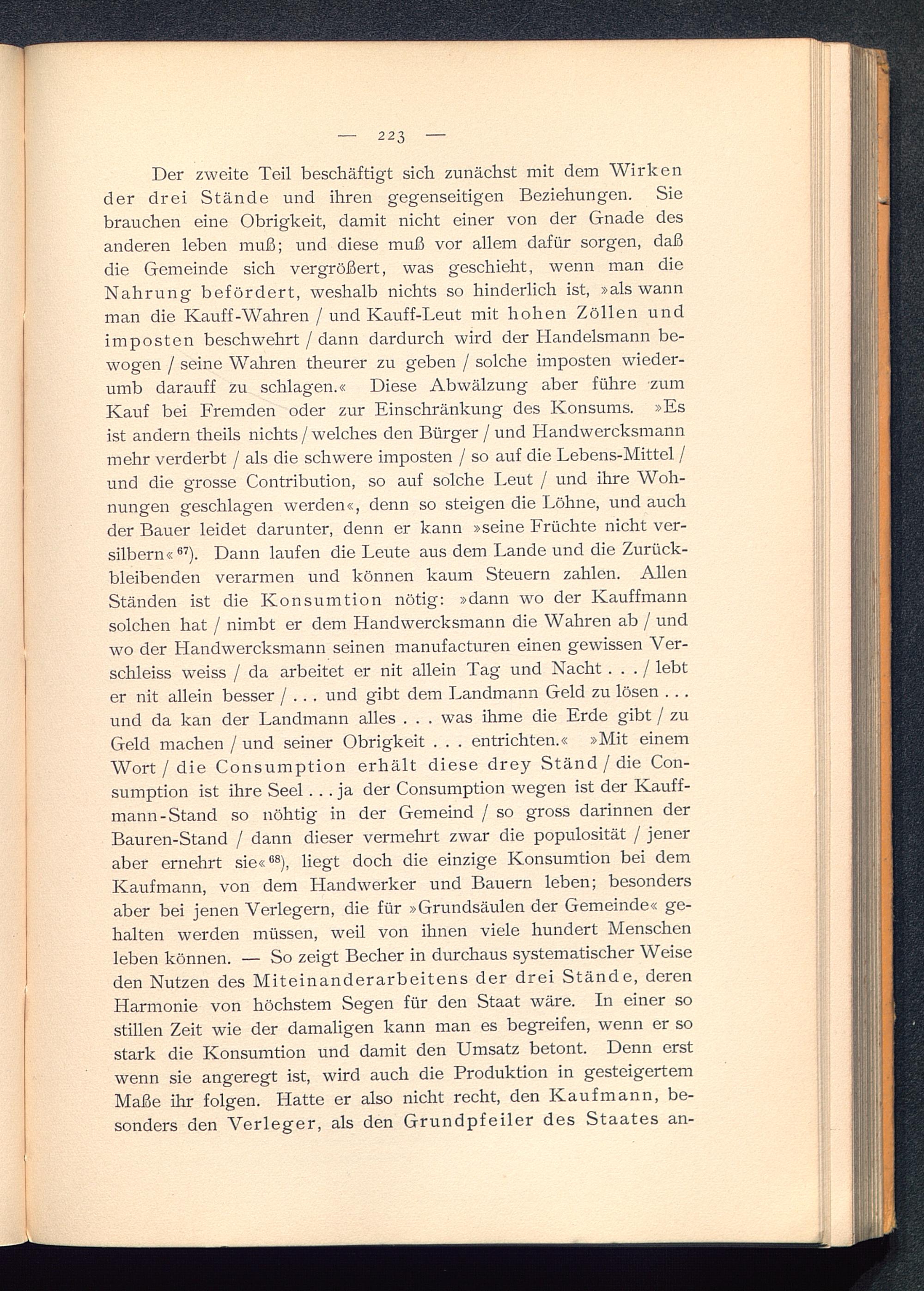 Der zweite Teil beschäftigt sich zunächst mit dem Wirkender drei Stände und ihren gegenseitigen Beziehungen. Siebrauchen eine Obrigkeit, damit nicht einer von der Gnade desanderen leben muß; und diese muß vor allem dafür sorgen, daßdie Gemeinde sich vergrößert, was geschieht, wenn man dieNahrung befördert, weshalb nichts so hinderlich ist, »als wannman die Kauff-Wahren / und Kauff-Leut mit hohen Zöllen undimposten beschwehrt / dann dardurch wird der Handelsmann be-wogen / seine Wahren theurer zu geben / solche imposten wieder-umb darauff zu schlagen.« Diese Abwälzung aber führe zumKauf bei Fremden oder zur Einschränkung des Konsums. »Esist andern theils nichts / welches den Bürger / und Handwercksmannmehr verderbt / als die schwere imposten / so auf die Lebens-Mittel /und die grosse Contribution, so auf solche Leut / und ihre Woh-nungen geschlagen werden«, denn so steigen die Löhne, und auchder Bauer leidet darunter, denn er kann »seine Früchte nicht ver-silbern« 87 ). Dann laufen die Leute aus dem Lande und die Zurück-bleibenden verarmen und können kaum Steuern zahlen. AllenStänden ist die Konsumtion nötig: »dann wo der Kauffmannsolchen hat / nimbt er dem Handwercksmann die Wahren ab / undwo der Handwercksmann seinen manufacturen einen gewissen Ver-schleiss weiss / da arbeitet er nit allein Tag und Nacht . . . / lebter nit allein besser / .. . und gibt dem Landmann Geld zu lösen . ..und da kan der Landmann alles . . . was ihme die Erde gibt / zuGeld machen / und seiner Obrigkeit . . . entrichten.« »Mit einemWort / die Consumption erhält diese drey Ständ / die Con-sumption ist ihre Seel... ja der Consumption wegen ist der Kauff-mann-Stand so nöhtig in der Gemeind / so gross darinnen derBauren-Stand / dann dieser vermehrt zwar die populosität / jeneraber ernehrt sie« 88 ), liegt doch die einzige Konsumtion bei demKaufmann, von dem Handwerker und Bauern leben; besondersaber bei jenen Verlegern, die für »Grundsäulen der Gemeinde« ge-halten werden müssen, weil von ihnen viele hundert Menschenleben können. — So zeigt Becher in durchaus systematischer Weiseden Nutzen des Miteinanderarbeitens der drei Stände, derenHarmonie von höchstem Segen für den Staat wäre. In einer sostillen Zeit wie der damaligen kann man es begreifen, wenn er sostark die Konsumtion und damit den Umsatz betont. Denn erstwenn sie angeregt ist, wird auch die Produktion in gesteigertemMaße ihr folgen. Hatte er also nicht recht, den Kaufmann, be-sonders den Verleger, als den Grundpfeiler des Staates an-