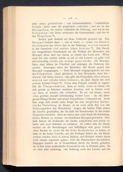 Becher geht deshalb auf diese Todfeinde genauer ein. DasMonopol besteht dann — wie er meint — »wann ein Glied inder Gemeind das allein hat in der Nahrung / worvon sonstenin der Gemeinde viel andere leben könten« 77 ). Der Zweckder bürgerlichen Gesellschaft sei die Vielheit der Menschen, dasMonopol diene aber nur einem, so würde das Land arm. Wennauch der eine reicher würde, so sei es viel besser, es gäbe vielmittelmäßig reiche als wenige ganz reiche. Die Monopo-listen aber lebten im Überfluß und entzögen die Nahrung denandern. Deswegen seien die Behörden mit Recht gegen dasMonopol vorgegangen. — Dem Monopol entgegengesetzt sei nundas Polypolium, »dann gleichwie in dem Monopolio einer hat /worvon viel leben können / also gibt das Polypolium allen dieses,worvon nur etliche leben können«, sie sind »beyde der civilsocietät höchste Feind« 78 ). Unter dem Polypol versteht er eigent-lich die Überproduktion, denn er meint, wenn an einem Ortsich gerade 50 Schuster ernähren könnten, und es kämen noch150 dazu, so würden alle verderben. Es sei viel besser, wenn»eine gewisse Anzahl mittelmässig reicher Leut / als ein über-grosse Mänge Bettler und armer Polypolisten« vorhanden sei. Auchhier zeigt sich wieder seine Sorge um eine möglichst harmo-nische Verteilung im Staate; er ist noch nicht frei von derNahrungsidee des Mittelalters. Gegen die beiden Übel wärendie Zünfte geschaffen, die die Zahl der Flandwerker in die rechteProportion brächten. Aber sie wären jetzt auch durch die Schwierig-keiten, Meister zu werden, ein heimliches Monopol geworden. Des-halb hätten die Flolländer die Zünfte aufgehoben und jedem er-laubt, sich nach Belieben zu ernähren. So reißen sich die Hand-werker um die Bestellungen und befleißigen sich guter Arbeit.Aber Becher ist nicht für die freie Konkurrenz zu haben, ersieht in ihr keine Vorteile, nur die Verleger hätten sie, die Hand-werker würden doch in Armut bleiben, und Holland würde darannoch einmal zugrunde gehen, weil die Handwerker davonliefen;hingegen würden sie in Deutschland durch die Zünfte gehalten,da es hier keine ausländische Konsumtion wie in Holland gäbe. Essei aber sehr schwierig, »die Nahrung nach den Leuten und die