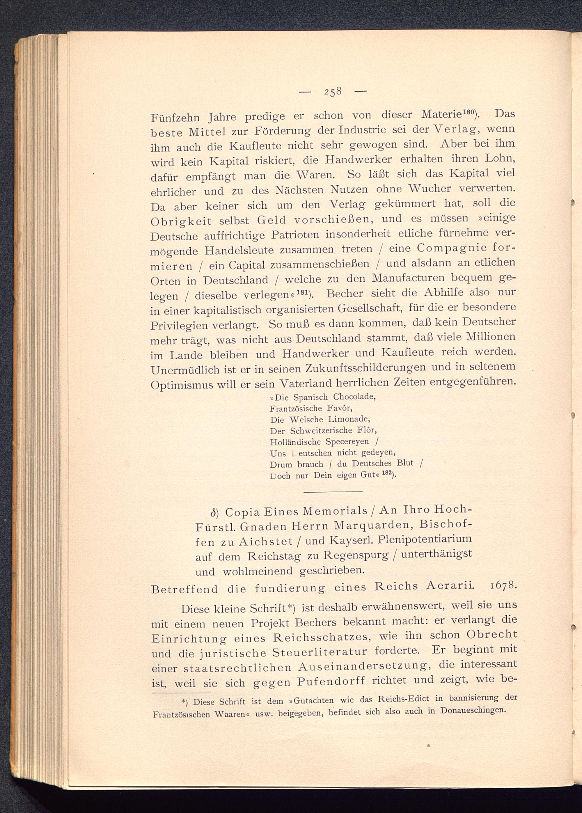 Diese kleine Schrift*) ist deshalb erwähnenswert, weil sie unsmit einem neuen Projekt Bechers bekannt macht: er verlangt dieEinrichtung eines Reichsschatzes, wie ihn schon Obrechtund die juristische Steuerliteratur forderte. Er beginnt miteiner staatsrechtlichen Auseinandersetzung, die interessantist, weil sie sich gegen Pufendorff richtet und zeigt, wie be-