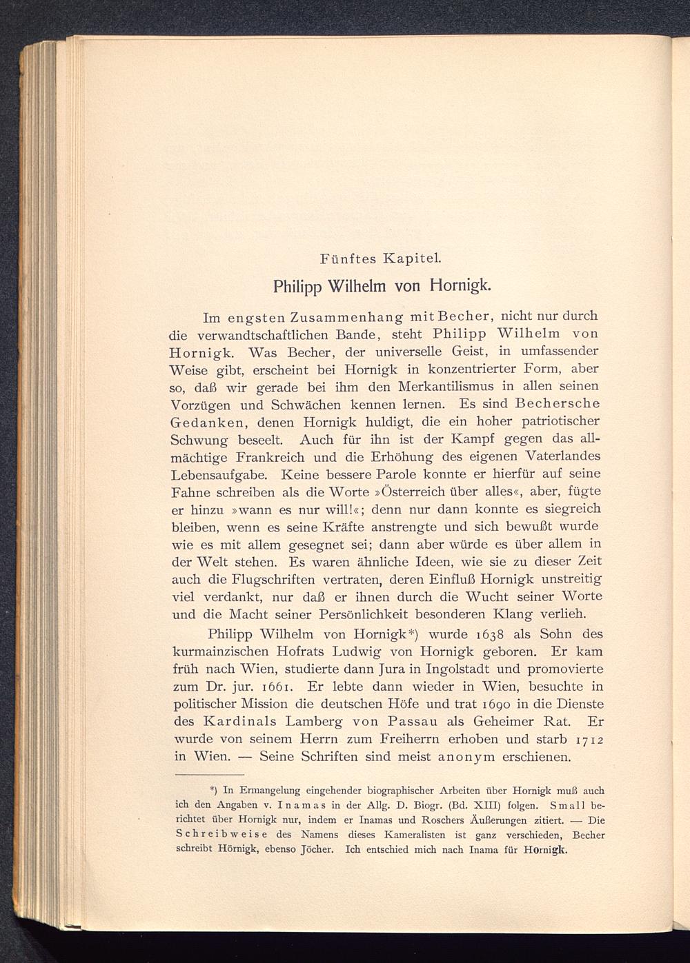 Philipp Wilhelm von Hornigk*) wurde 1638 als Sohn deskurmainzischen Hofrats Ludwig von Hornigk geboren. Er kamfrüh nach Wien, studierte dann Jura in Ingolstadt und promoviertezum Dr. jur. 1661. Er lebte dann wieder in Wien , besuchte inpolitischer Mission die deutschen Höfe und trat 1690 in die Dienstedes Kardinals Lamberg von Passau als Geheimer Rat. Erwurde von seinem Herrn zum Freiherrn erhoben und starb 1712in Wien . — Seine Schriften sind meist anonym erschienen.