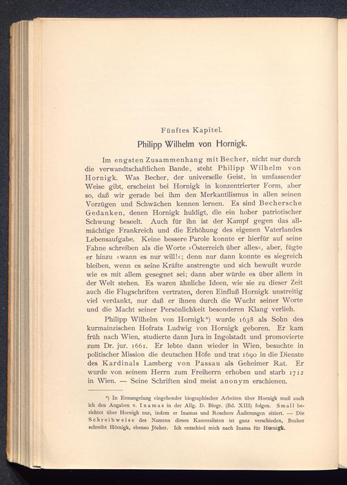 *) In Ermangelung eingehender biographischer Arbeiten über Hornigk muß auchich den Angaben v. I n a m a s in der Allg. D. Biogr. (Bd. XIII) folgen. Small be-richtet über Hornigk nur, indem er Inamas und Roschers Äußerungen zitiert. — DieSchreibweise des Namens dieses Kameralisten ist ganz verschieden, Becherschreibt Hornigk, ebenso Jöcher. Ich entschied mich nach Inama für Hornigk.