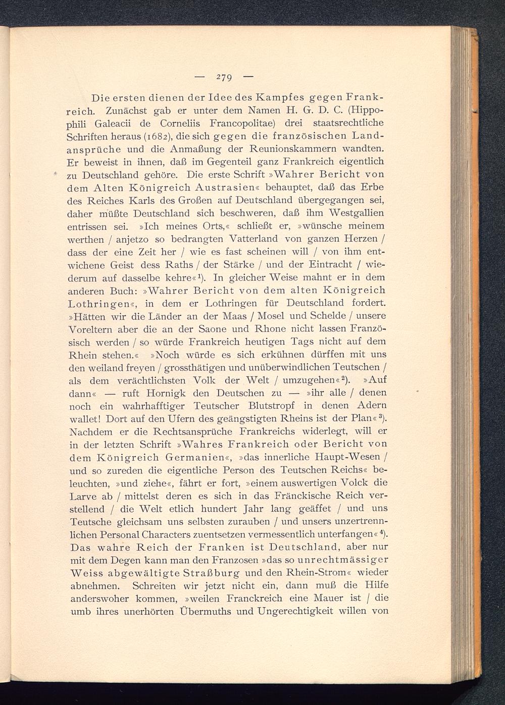 Die ersten dienen der Idee des Kampfes gegen Frank-reich . Zunächst gab er unter dem Namen H. G. D. C. (Hippo-phili Galeacii de Corneliis Francopolitae) drei staatsrechtlicheSchriften heraus (1682), die sich gegen die französischen Land-ansprüche und die Anmaßung der Reunionskammern wandten.Er beweist in ihnen, daß im Gegenteil ganz Frankreich eigentlichzu Deutschland gehöre. Die erste Schrift »Wahrer Bericht vondem Alten Königreich Austrasien« behauptet, daß das Erbedes Reiches Karls des Großen auf Deutschland übergegangen sei,daher müßte Deutschland sich beschweren, daß ihm Westgallienentrissen sei. »Ich meines Orts,« schließt er, »wünsche meinemwerthen / anjetzo so bedrängten Vatterland von ganzen Herzen /dass der eine Zeit her / wie es fast scheinen will / von ihm ent-wichene Geist dess Raths / der Stärke / und der Eintracht / wie-derum auf dasselbe kehre« 1 ). In gleicherweise mahnt er in demanderen Buch: »Wahrer Bericht von dem alten KönigreichLothringen«, in dem er Lothringen für Deutschland fordert.»Hätten wir die Länder an der Maas / Mosel und Schelde / unsereVoreltern aber die an der Saone und Rhone nicht lassen Franzö-sisch werden / so würde Frankreich heutigen Tags nicht auf demRhein stehen.« »Noch würde es sich erkühnen dürften mit unsden weiland freyen / grossthätigen und unüberwindlichen Teutschen /als dem verächtlichsten Volk der Welt / umzugehen« 2 ). »Aufdann« — ruft Hornigk den Deutschen zu — »ihr alle / denennoch ein wahrhafftiger Teutscher Blutstropf in denen Adernwallet! Dort auf den Ufern des geängstigten Rheins ist der Plan« 3 ).Nachdem er die Rechtsansprüche Frankreichs widerlegt, will erin der letzten Schrift »Wahres Frankreich oder Bericht vondem Königreich Germanien «, »das innerliche Flaupt-Wesen /und so Zureden die eigentliche Person des Teutschen Reichs« be-leuchten, »und ziehe«, fährt er fort, »einem auswertigen Volck dieLarve ab / mittelst deren es sich in das Fränckische Reich ver-stellend / die Welt etlich hundert Jahr lang geäffet / und unsTeutsche gleichsam uns Selbsten zurauben / und unsers unzertrenn-lichen Personal Characters zuentsetzen vermessentlich unterfangen« 4 ).Das wahre Reich der Franken ist Deutschland , aber nurmit dem Degen kann man den Franzosen »das so unrechtmässigerWeiss abgewältigte Straßburg und den Rhein -Strom« wiederabnehmen. Schreiten wir jetzt nicht ein, dann muß die Hilfeanderswoher kommen, »weilen Franckreich eine Mauer ist / dieumb ihres unerhörten Übermuths und Ungerechtigkeit willen von