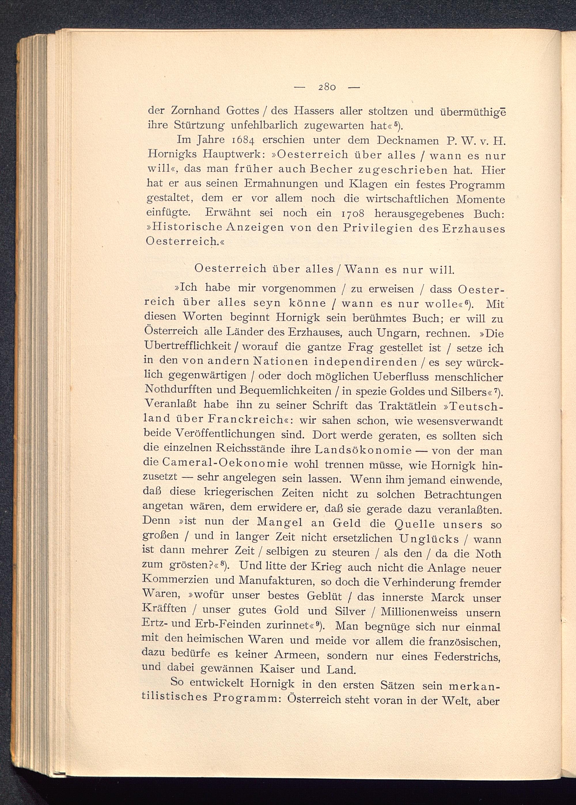 Im Jahre 1684 erschien unter dem Decknamen P. W. v. H.Hornigks Hauptwerk: »Oesterreich über alles / wann es nurwill«, das man früher auch Becher zugeschrieben hat. Hierhat er aus seinen Ermahnungen und Klagen ein festes Programmgestaltet, dem er vor allem noch die wirtschaftlichen Momenteeinfügte. Erwähnt sei noch ein 1708 herausgegebenes Buch:»Historische Anzeigen von den Privilegien des ErzhausesOesterreich.«