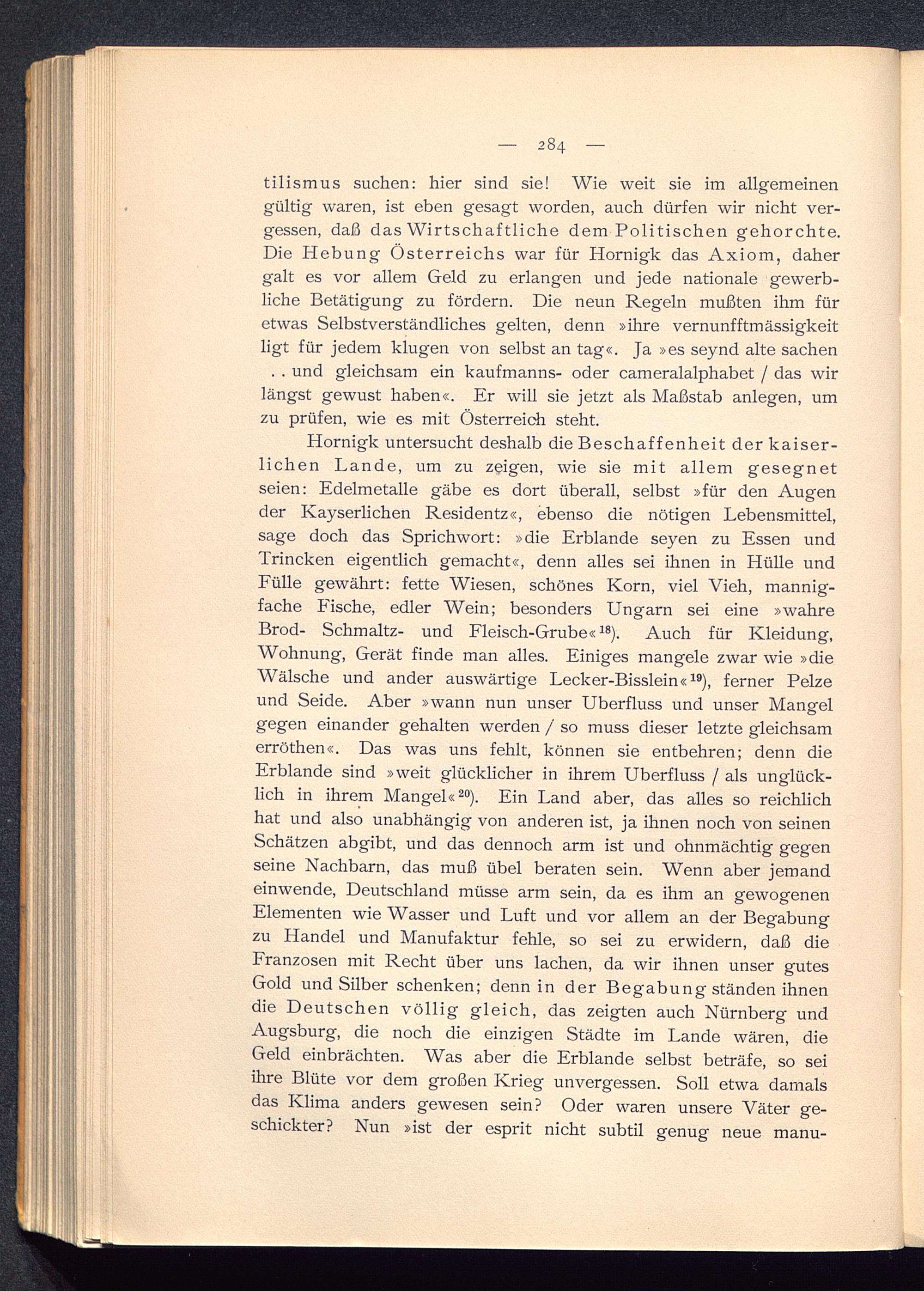 tilismus suchen: hier sind sie! Wie weit sie im allgemeinengültig waren, ist eben gesagt worden, auch dürfen wir nicht ver-gessen, daß das Wirtschaftliche dem Politischen gehorchte.Die Hebung Österreichs war für Hornigk das Axiom, dahergalt es vor allem Geld zu erlangen und jede nationale gewerb-liche Betätigung zu fördern. Die neun Regeln mußten ihm füretwas Selbstverständliches gelten, denn »ihre vernunfftmässigkeitligt für jedem klugen von selbst an tag«. Ja »es seynd alte Sachen. . und gleichsam ein kaufmanns- oder cameralalphabet / das wirlängst gewust haben«. Er will sie jetzt als Maßstab anlegen, umzu prüfen, wie es mit Österreich steht.