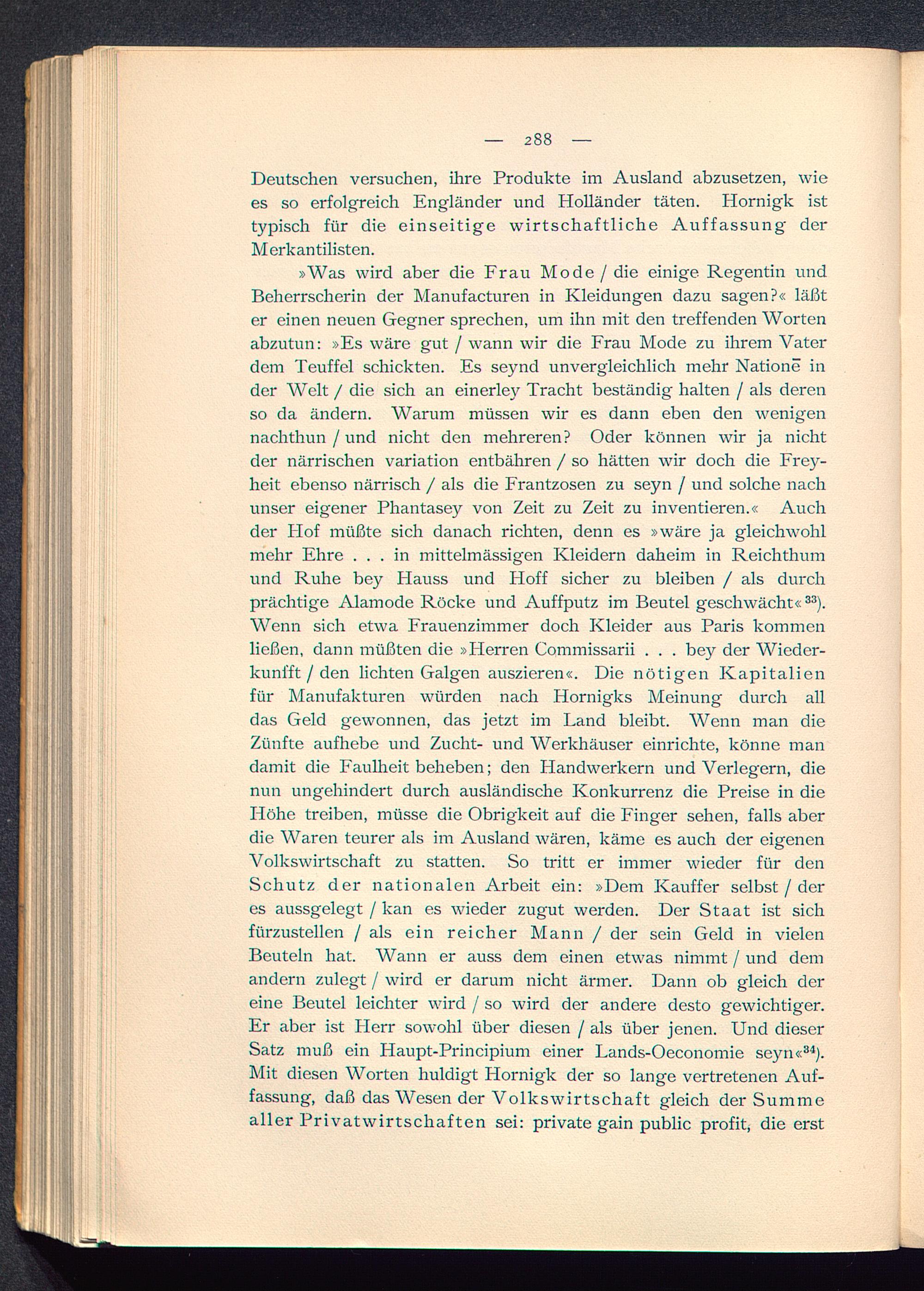 »Was wird aber die Frau Mode / die einige Regentin undBeherrscherin der Manufacturen in Kleidungen dazu sagen?« läßter einen neuen Gegner sprechen, um ihn mit den treffenden Wortenabzutun: »Es wäre gut / wann wir die Frau Mode zu ihrem Vaterdem Teuffel schickten. Es seynd unvergleichlich mehr Natione inder Welt / die sich an einerley Tracht beständig halten / als derenso da ändern. Warum müssen wir es dann eben den wenigennachthun / und nicht den mehreren? Oder können wir ja nichtder närrischen Variation entbähren / so hätten wir doch die Frey-heit ebenso närrisch / als die Frantzosen zu seyn / und solche nachunser eigener Phantasey von Zeit zu Zeit zu inventieren.« Auchder ITof müßte sich danach richten, denn es »wäre ja gleichwohlmehr Ehre ... in mittelmässigen Kleidern daheim in Reichthumund Ruhe bey Hauss und Hoff sicher zu bleiben / als durchprächtige Alamode Röcke und Auffputz im Beutel geschwächt« 33 ).Wenn sich etwa Frauenzimmer doch Kleider aus Paris kommenließen, dann müßten die »Herren Commissarii . . . bey der Wieder-kuni'ft / den lichten Galgen auszieren«. Die nötigen Kapitalienfür Manufakturen würden nach Hornigks Meinung durch alldas Geld gewonnen, das jetzt im Land bleibt. Wenn man dieZünfte aufhebe und Zucht- und Werkhäuser einrichte, könne mandamit die Faulheit beheben; den Handwerkern und Verlegern, dienun ungehindert durch ausländische Konkurrenz die Preise in dieHöhe treiben, müsse die Obrigkeit auf die Finger sehen, falls aberdie Waren teurer als im Ausland wären, käme es auch der eigenenVolkswirtschaft zu statten. So tritt er immer wieder für denSchutz der nationalen Arbeit ein: »Dem Kauffer selbst / deres aussgelegt / kan es wieder zugut werden. Der Staat ist sichfürzustellen / als ein reicher Mann / der sein Geld in vielenBeuteln hat. Wann er auss dem einen etwas nimmt / und demandern zulegt / wird er darum nicht ärmer. Dann ob gleich dereine Beutel leichter wird / so wird der andere desto gewichtiger.Er aber ist Herr sowohl über diesen / als über jenen. Und dieserSatz muß ein Haupt-Principium einer Lands-Oeconomie seyn« 34 ).Mit diesen Worten huldigt Hornigk der so lange vertretenen Auf-fassung, daß das Wesen der Volkswirtschaft gleich der Summealler Privatwirtschaften sei: private gain public profit, die erst