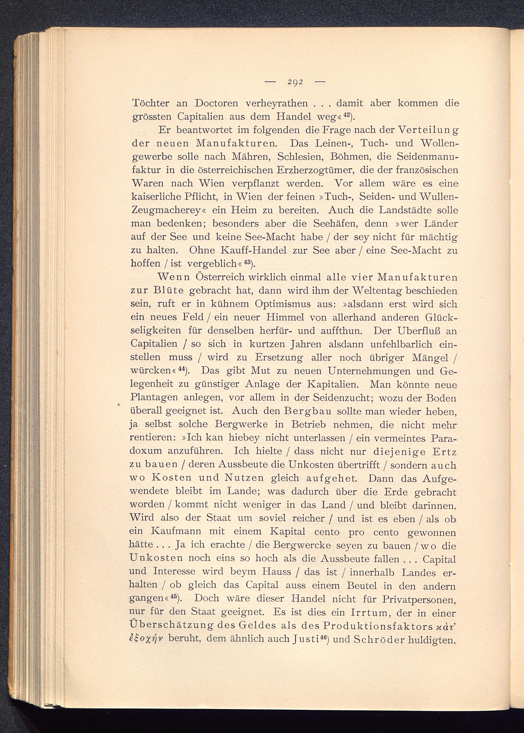 Wenn Österreich wirklich einmal alle vier Manufakturenzur Blüte gebracht hat, dann wird ihm der Weltentag beschiedensein, ruft er in kühnem Optimismus aus: »alsdann erst wird sichein neues Feld / ein neuer Himmel von allerhand anderen Glück-seligkeiten für denselben herfür- und auffthun. Der Überfluß anCapitalien / so sich in kurtzen Jahren alsdann unfehlbarlich ein-stellen muss / wird zu Ersetzung aller noch übriger Mängel /würcken« 44 ). Das gibt Mut zu neuen Unternehmungen und Ge-legenheit zu günstiger Anlage der Kapitalien. Man könnte neuePlantagen anlegen, vor allem in der Seidenzucht; wozu der Bodenüberall geeignet ist. Auch den Bergbau sollte man wieder heben,ja selbst solche Bergwerke in Betrieb nehmen, die nicht mehrrentieren: »Ich kan hiebey nicht unterlassen / ein vermeintes Para-doxum anzuführen. Ich hielte / dass nicht nur diejenige Ertzzu bauen / deren Aussbeute die Unkosten übertrifft / sondern auchwo Kosten und Nutzen gleich aufgehet. Dann das Aufge-wendete bleibt im Lande; was dadurch über die Erde gebrachtworden / kommt nicht weniger in das Land / und bleibt darinnen.Wird also der Staat um soviel reicher / und ist es eben / als obein Kaufmann mit einem Kapital cento pro cento gewonnenhätte ... Ja ich erachte / die Bergwercke seyen zu bauen / wo dieUnkosten noch eins so hoch als die Aussbeute fallen . . . Capitalund Interesse wird beym Hauss / das ist / innerhalb Landes er-halten / ob gleich das Capital auss einem Beutel in den anderngangen« 46 ). Doch wäre dieser Handel nicht für Privatpersonen,nur für den Staat geeignet. Es ist dies ein Irrtum, der in einerÜberschätzung des Geldes als des Produktionsfaktors xär’egoxrjv beruht, dem ähnlich auch Justi 46 ) und Schröder huldigten.