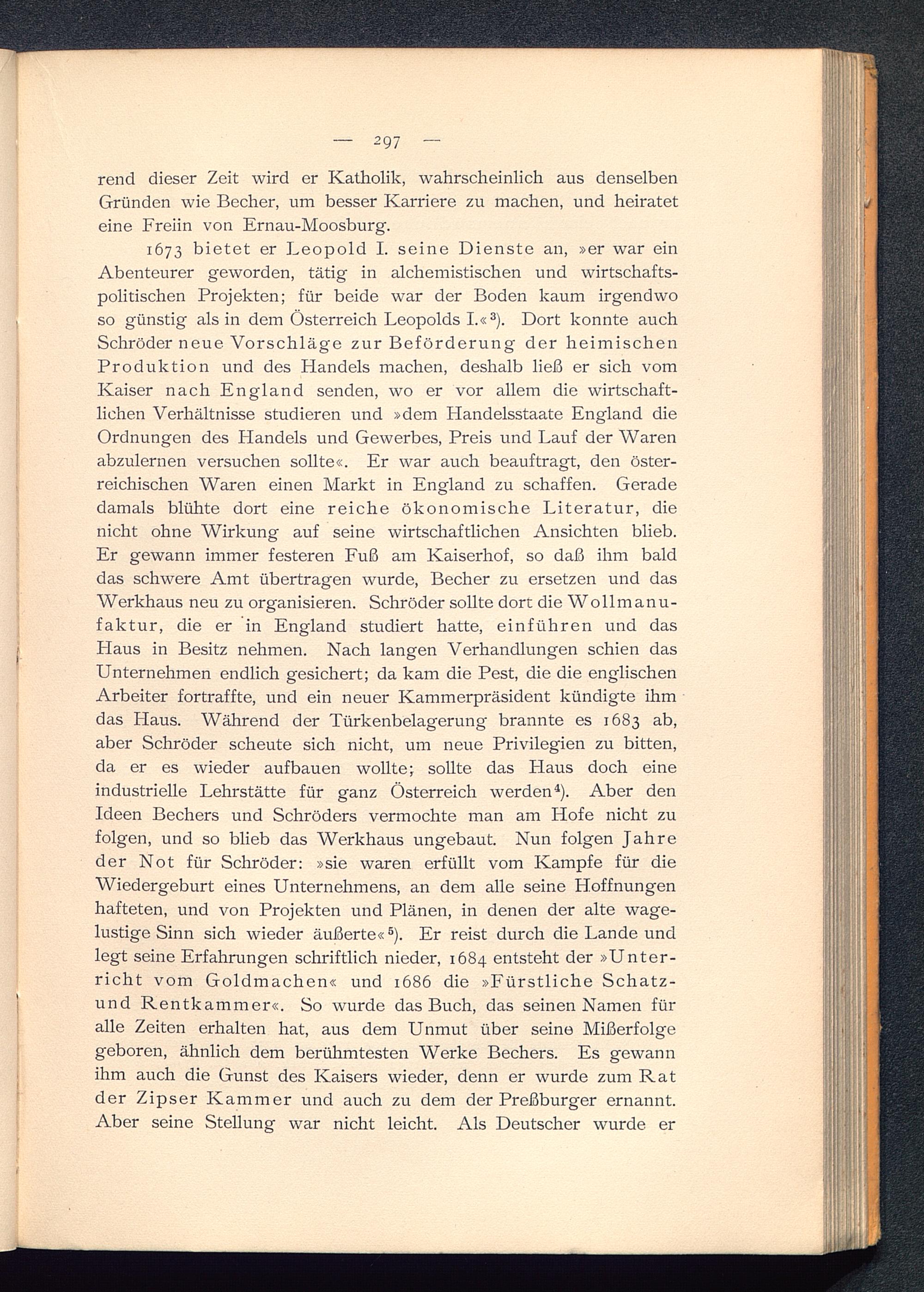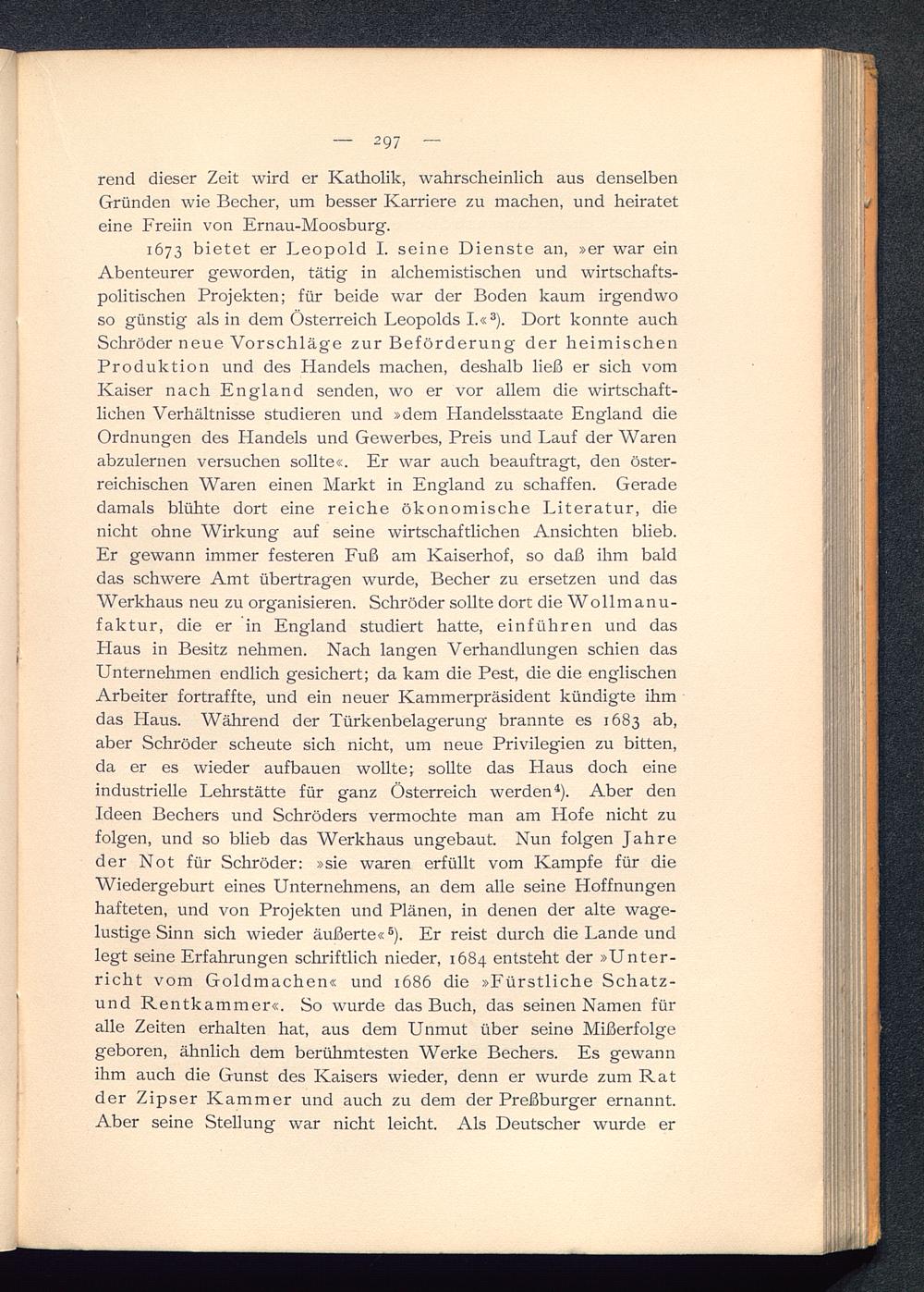 1673 bietet er Leopold I. seine Dienste an, »er war einAbenteurer geworden, tätig in alchemistischen und wirtschafts-politischen Projekten; für beide war der Boden kaum irgendwoso günstig als in dem Österreich Leopolds I .« 3 ). Dort konnte auchSchröder neue Vorschläge zur Beförderung der heimischenProduktion und des Handels machen, deshalb ließ er sich vomKaiser nach England senden, wo er vor allem die wirtschaft-lichen Verhältnisse studieren und »dem Handelsstaate England dieOrdnungen des Handels und Gewerbes, Preis und Lauf der Warenabzulernen versuchen sollte«. Er war auch beauftragt, den öster-reichischen Waren einen Markt in England zu schaffen. Geradedamals blühte dort eine reiche ökonomische Literatur, dienicht ohne Wirkung auf seine wirtschaftlichen Ansichten blieb.Er gewann immer festeren Fuß am Kaiserhof, so daß ihm balddas schwere Amt übertragen wurde, Becher zu ersetzen und dasWerkhaus neu zu organisieren. Schröder sollte dort die Wollmanu-faktur, die er in England studiert hatte, einführen und dasFlaus in Besitz nehmen. Nach langen Verhandlungen schien dasUnternehmen endlich gesichert; da kam die Pest, die die englischenArbeiter fortraffte, und ein neuer Kammerpräsident kündigte ihmdas Haus. Während der Türkenbelagerung brannte es 1683 ab,aber Schröder scheute sich nicht, um neue Privilegien zu bitten,da er es wieder auf bauen wollte; sollte das Flaus doch eineindustrielle Lehrstätte für ganz Österreich werden 4 ). Aber denIdeen Bechers und Schröders vermochte man am Hofe nicht zufolgen, und so blieb das Werkhaus ungebaut. Nun folgen Jahreder Not für Schröder: »sie waren erfüllt vom Kampfe für dieWiedergeburt eines Unternehmens, an dem alle seine Hoffnungenhafteten, und von Projekten und Plänen, in denen der alte wage-lustige Sinn sich wieder äußerte« 6 ). Er reist durch die Lande undlegt seine Erfahrungen schriftlich nieder, 1684 entsteht der »Unter-richt vom Goldmachen« und 1686 die »Fürstliche Schatz-und Rentkammer«. So wurde das Buch, das seinen Namen füralle Zeiten erhalten hat, aus dem Unmut über seine Mißerfolgegeboren, ähnlich dem berühmtesten Werke Bechers. Es gewannihm auch die Gunst des Kaisers wieder, denn er wurde zum Ratder Zipser Kammer und auch zu dem der Preßburger ernannt.Aber seine Stellung war nicht leicht. Als Deutscher wurde er
