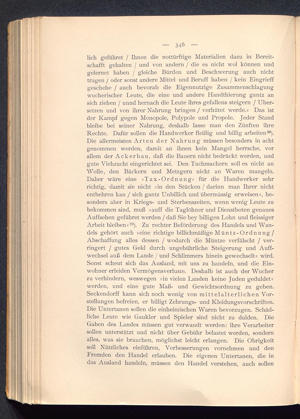 lieh geführet / Ihnen die notdürftige Materialien dazu in Bereit-schafft gehalten / und von andern / die es nicht wol können undgelernet haben / gleiche Bürden und Beschwerung auch nichttragen / oder sonst andere Mittel und Beruff haben / kein Eingrieffgeschehe / auch bevorab die Eigennützige Zusammenschlagungwucherischer Leute, die eine und andere Handthierung gantz ansich ziehen / unnd hernach die Leute ihres gefallens steigern / Über-setzen und von ihrer Nahrung bringen / verhütet werde.« Das istder Kampf gegen Monopole, Polypole und Propole. Jeder Standbleibe bei seiner Nahrung, deshalb lasse man den Zünften ihreRechte. Dafür sollen die Handwerker fleißig und billig arbeiten 28 ).Die allermeisten Arten der Nahrung müssen besonders in achtgenommen werden, damit an ihnen kein Mangel herrsche, vorallem der Ackerbau, daß die Bauern nicht bedrückt werden, undgute Viehzucht eingerichtet sei. Den Tuchmachern soll es nicht anWolle, den Bäckern und Metzgern nicht an Waren mangeln.Daher wäre eine »Tax-Ordnung« für die Handwerker sehrrichtig, damit sie nicht »in den Stücken / darinn man Ihrer nichtentbehren kan / sich gantz Unbillich und übermässig erweisen«, be-sonders aber in Kriegs- und Sterbenszeiten, wenn wenig Leute zubekommen sind, muß »auff die Taglöhner und Dienstboten genauesAuffsehen geführet werden / daß Sie bey billigen Lohn und fleissigerArbeit bleiben« 29 ). Zu rechter Beförderung des Handels und Wan-dels gehört auch »eine richtige billichmäßige Müntz-Ordnung/Abschaffung alles dessen / wodurch die Müntze verfälscht / ver-ringert / gutes Geld durch ungebührliche Steigerung und Auff-wechsel auß dem Lande / und Schlimmers hinein gewechselt« wird.Sonst scheut sich das Ausland, mit uns zu handeln, und die Ein-wohner erleiden Vermögensverluste. Deshalb ist auch der Wucherzu verhindern, weswegen »in vielen Landen keine Juden geduldet«werden, und eine gute Maß- und Gewichtsordnung zu geben.Seckendorff kann sich noch wenig von mittelalterlichen Vor-stellungen befreien, er billigt Zehrungs- und Kleidungsvorschriften.Die Untertanen sollen die einheimischen Waren bevorzugen. Schäd-liche Leute w r ie Gaukler und Spieler sind nicht zu dulden. DieGaben des Landes müssen gut verwandt werden: ihre Verarbeitersollen unterstützt und nicht über Gebühr belastet werden, sondernalles, was sie brauchen, möglichst leicht erlangen. Die Obrigkeitsoll Nützliches einführen, Verbesserungen vornehmen und denFremden den Handel erlauben. Die eigenen Untertanen, die indas Ausland handeln, müssen den Handel verstehen, auch sollen