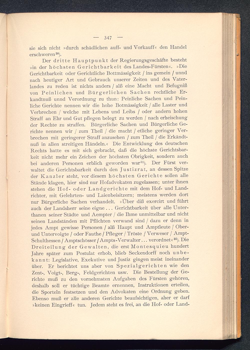 Der dritte Hauptpunkt der Regierungsgeschäfte besteht»in der höchsten Gerichtbarkeit des Landes-Fürsten«. »DieGerichtbarkeit oder Gerichtliche Bottmässigkeit / ins gemein / unndnach heutiger Art und Gebrauch unserer Zeiten und des Vater-landes zu reden ist nichts anders / alß eine Macht und Befugnißvon Peinlichen und Bürgerlichen Sachen rechtliche Er-kandtnuß unnd Verordnung zu thun: Peinliche Sachen und Pein-liche Gerichte nennen wir die hohe Botmässigkeit / alle Laster undVerbrechen / welche mit Lebens und Leibs / oder andern hohenStraff an Ehr und Gut pflegen belegt zu werden / nach erheischungder Rechte zu straffen. Bürgerliche Sachen und Bürgerliche Ge-richte nennen wir / zum Theil / die macht / etliche geringer Ver-brechen mit geringerer Straff anzusehen / zum Theil / die Erkändt-nuß in allen streitigen Pländeln.« Die Entwicklung des deutschenRechts hatte es mit sich gebracht, daß die höchste Gerichtsbar-keit nicht mehr ein Zeichen der höchsten Obrigkeit, sondern auchbei anderen Personen erblich geworden war 31 ). Der Fürst ver-waltet die Gerichtsbarkeit durch den Justizrat, an dessen Spitzeder Kanzler steht, vor diesem höchsten Gerichte sollen alleStände klagen, hier sind nur Plofadvokaten zugelassen; unter ihnenstehen die Hof- oder Landgerichte mit dem Hof- und Land-richter, mit Gelehrten- und Laienbeisitzern; meistens werden dortnur Bürgerliche Sachen verhandelt. »Über diß exercirt und führtauch der Landsherr seine eigne . . . Gerichtbarkeit über alle Unter-thanen seiner Städte und Aempter / die Ihme unmittelbar und nichtseinen Landständen mit Pflichten verwand sind / dazu er denn injedes A.mpt gewisse Personen / alß Haupt und Amptleute / Ober-und Untervoigte / oder Fauthe / Pfleger / Tröste / Verweser / Ampt-Schulthessen / Amptschösser/ Ampts-Verwalter... verordnet« 32 ). DieDreiteilung der Gewalten, die erst Montesquieu hundertJahre später zum Postulat erhob, blieb Seckendorff noch unbe-kannt: Legislative , Exekutive und Justiz gingen meist ineinanderüber. Er berichtet uns aber von Spezialgerichten wie denZent-, Voigt-, Berg-, Feldgerichten usw. Die Bestellung der Ge-richte muß zu den vornehmsten Aufgaben des Fürsten gehören,deshalb soll er tüchtige Beamte ernennen, Instruktionen erteilen,die Sporteln festsetzen und den Advokaten eine Ordnung geben.Ebenso muß er alle anderen Gerichte beaufsichtigen, aher er darf»keinen Eingrieff« tun. Jedem steht es frei, an die Hof- oder Land-