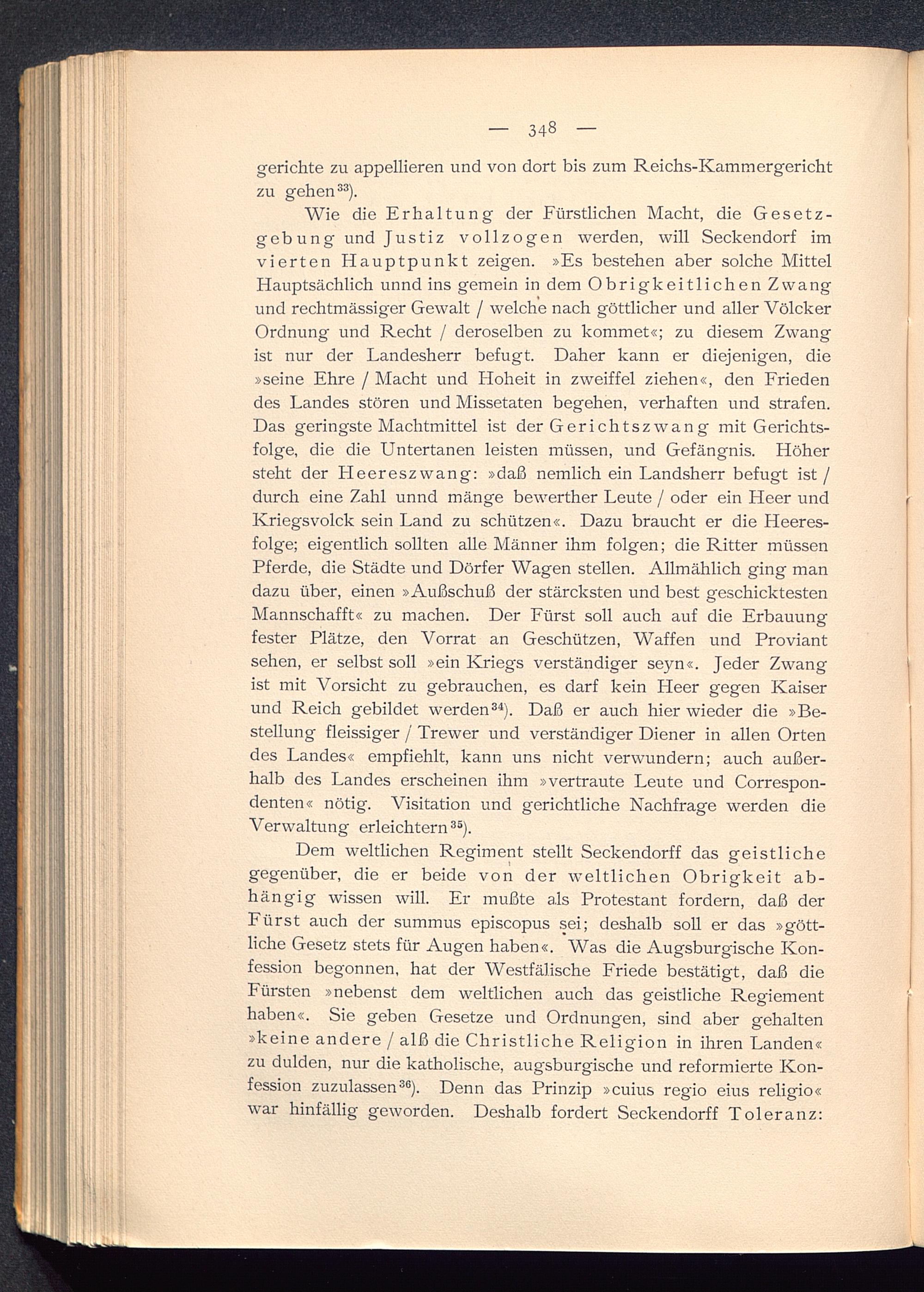 Dem weltlichen Regiment stellt Seckendorff das geistlichegegenüber, die er beide von der weltlichen Obrigkeit ab-hängig wissen will. Er mußte als Protestant fordern, daß derFürst auch der summus episcopus sei; deshalb soll er das »gött-liche Gesetz stets für Augen haben«. Was die Augsburgische Kon-fession begonnen, hat der Westfälische Friede bestätigt, daß dieFürsten »nebenst dem weltlichen auch das geistliche Regiementhaben«. Sie geben Gesetze und Ordnungen, sind aber gehalten»keine andere / alß die Christliche Religion in ihren Landen«zu dulden, nur die katholische, augsburgische und reformierte Kon-fession zuzulassen 36 ). Denn das Prinzip »cuius regio eius religio«war hinfällig geworden. Deshalb fordert Seckendorff Toleranz: