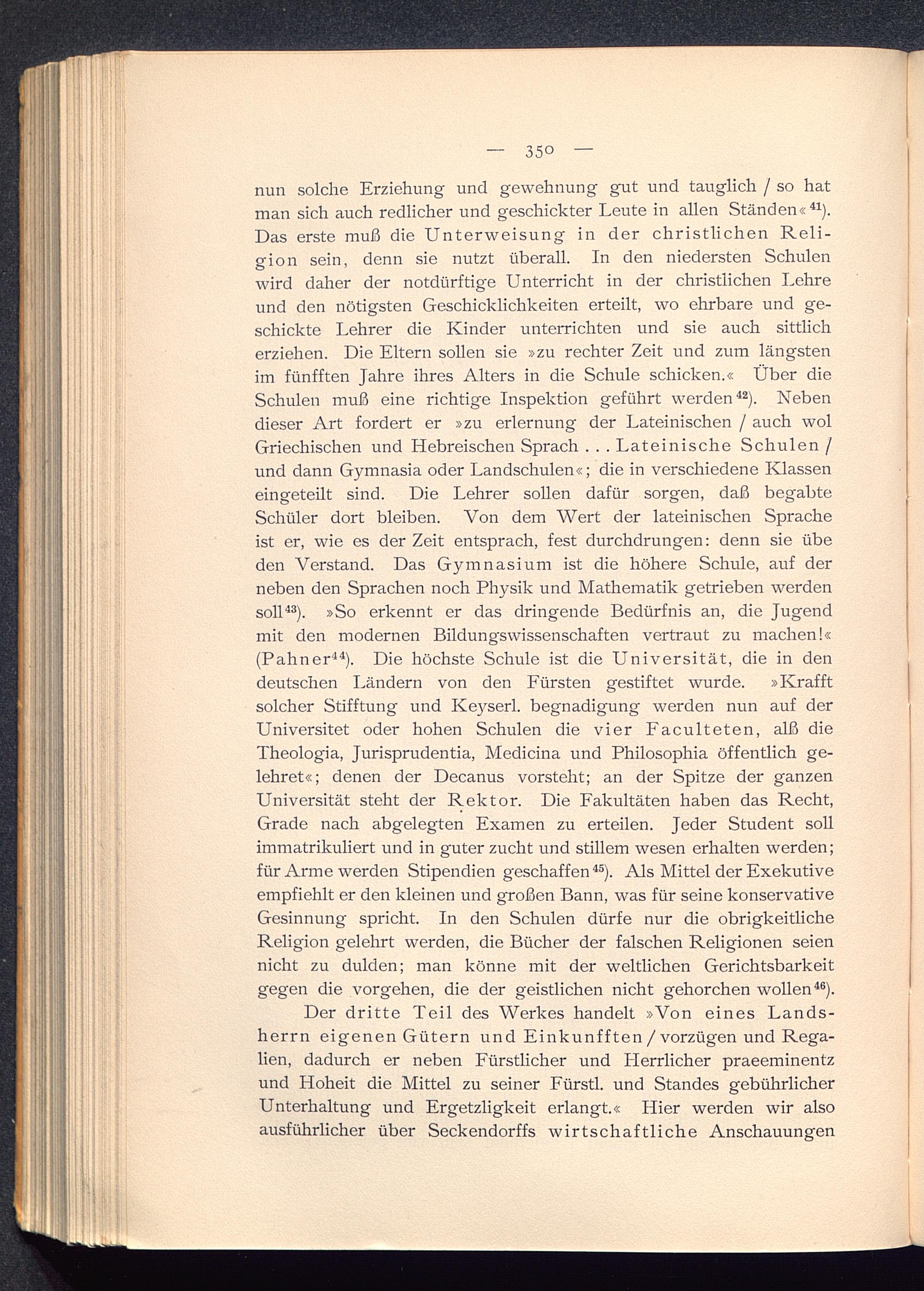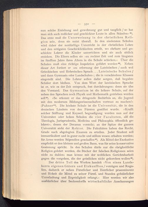 nun solche Erziehung und gewehnung gut und tauglich / so hatman sich auch redlicher und geschickter Leute in allen Ständen« 41 ).Das erste muß die Unterweisung in der christlichen Reli-o-ion sein, denn sie nutzt überall. In den niedersten Schulenwird daher der notdürftige Unterricht in der christlichen Lehreund den nötigsten Geschicklichkeiten erteilt, wo ehrbare und ge-schickte Lehrer die Kinder unterrichten und sie auch sittlicherziehen. Die Eltern sollen sie »zu rechter Zeit und zum längstenim fiinfften Jahre ihres Alters in die Schule schicken.« Über dieSchulen muß eine richtige Inspektion geführt werden 42 ). Nebendieser Art fordert er »zu erlernung der Lateinischen / auch wolGriechischen und Hebreischen Sprach . . . Lateinische Schulen /und dann Gymnasia oder Landschulen«; die in verschiedene Klasseneingeteilt sind. Die Lehrer sollen dafür sorgen, daß begabteSchüler dort bleiben. Von dem Wert der lateinischen Spracheist er, wie es derZeit entsprach, fest durchdrungen: denn sie übeden Verstand. Das Gymnasium ist die höhere Schule, auf derneben den Sprachen noch Physik und Mathematik getrieben werdensoll 43 ). »So erkennt er das dringende Bedürfnis an, die Jugendmit den modernen Bildungswissenschaften vertraut zu machen!«(Pahner 44 ). Die höchste Schule ist die Universität, die in dendeutschen Ländern von den Fürsten gestiftet wurde. »Krafftsolcher Stifftung und Kej^serl. begnadigung werden nun auf derUniversitet oder hohen Schulen die vier Faculteten, alß dieTheologia, Jurisprudentia, Medicina und Philosophia öffentlich ge-lehret«; denen der Decanus vorsteht; an der Spitze der ganzenUniversität steht der Rektor. Die Fakultäten haben das Recht,Grade nach abgelegten Examen zu erteilen. Jeder Student sollimmatrikuliert und in guter zucht und stillem wesen erhalten werden;für Arme werden Stipendien geschaffen 45 ). Als Mittel der Exekutiveempfiehlt er den kleinen und großen Bann, was für seine konservativeGesinnung spricht. In den Schulen dürfe nur die obrigkeitlicheReligion gelehrt werden, die Bücher der falschen Religionen seiennicht zu dulden; man könne mit der weltlichen Gerichtsbarkeitgegen die Vorgehen, die der geistlichen nicht gehorchen wollen 46 ).