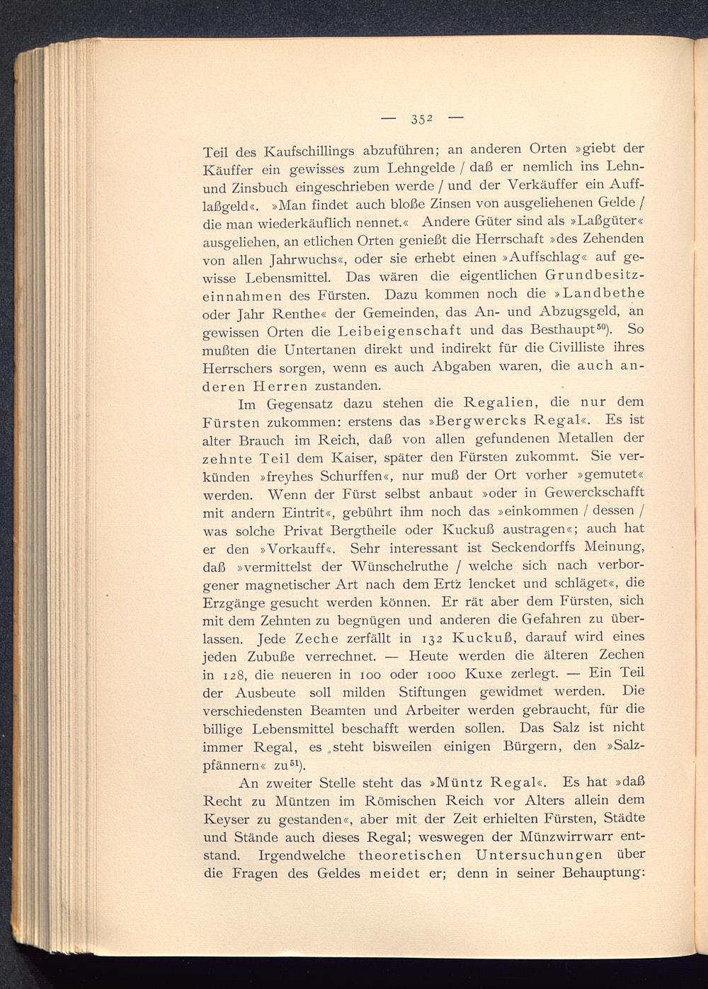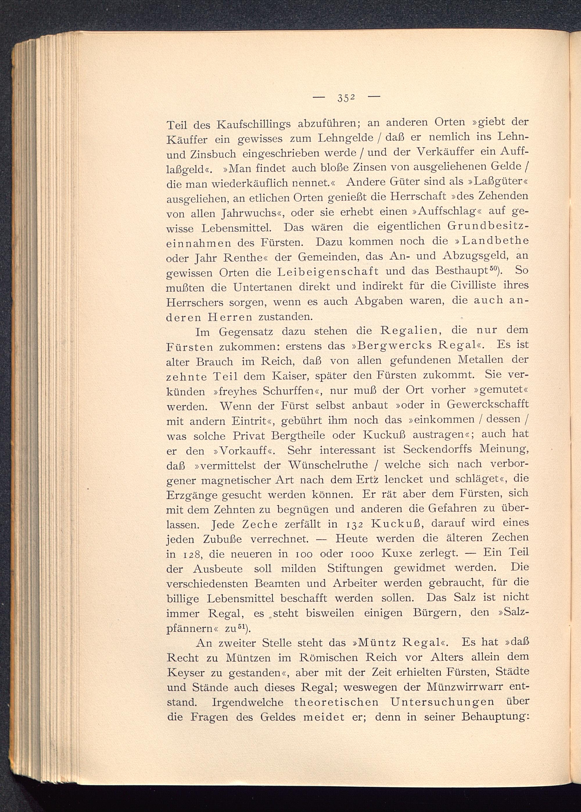 An zweiter Stelle steht das »Müntz Regal«. Es hat »daßRecht zu Müntzen im Römischen Reich vor Alters allein demKeyser zu gestanden«, aber mit der Zeit erhielten Fürsten , Städteund Stände auch dieses Regal; weswegen der Münzwirrwarr ent-stand. Irgendwelche theoretischen Untersuchungen überdie Fragen des Geldes meidet er; denn in seiner Behauptung: