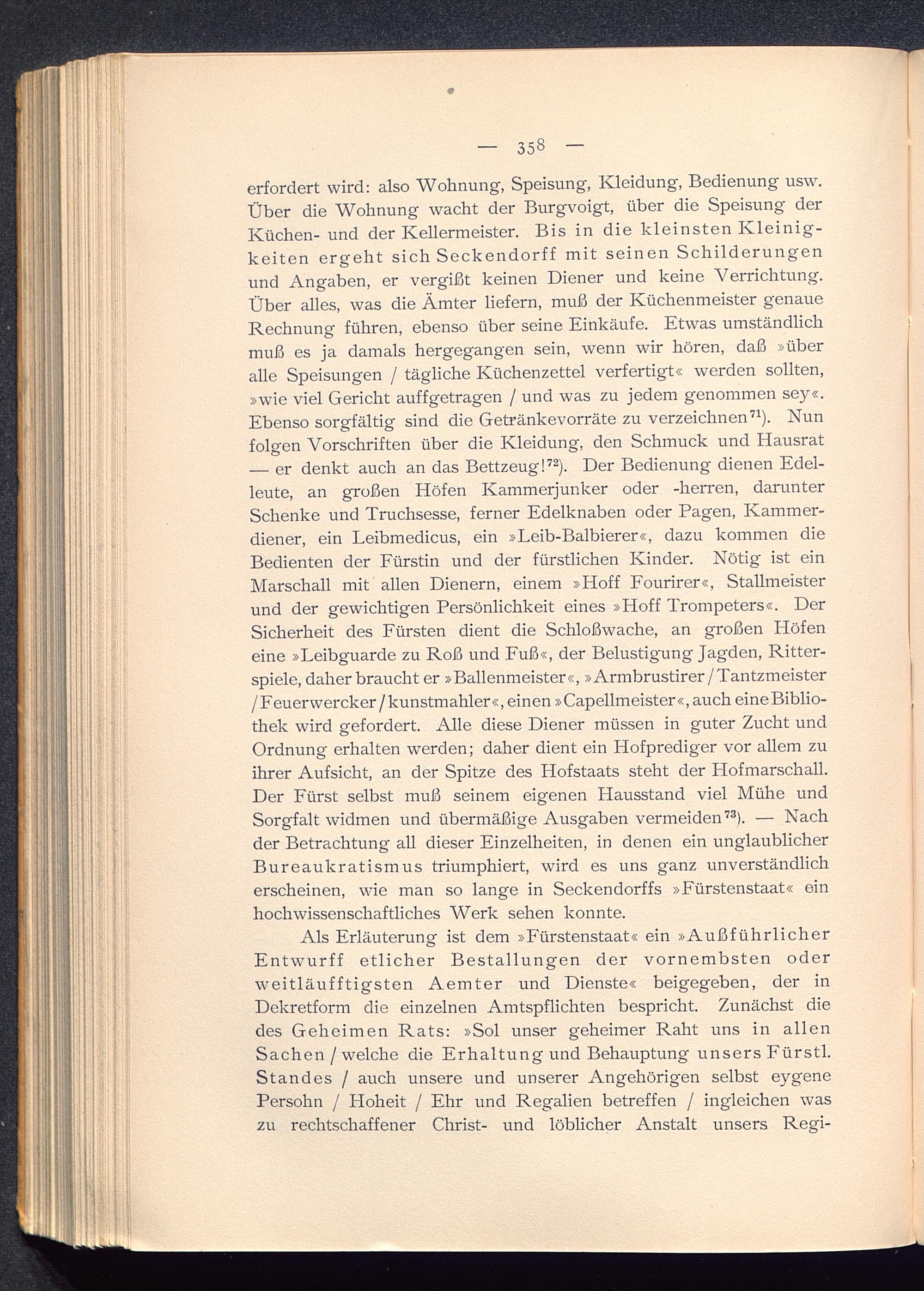 erfordert wird: also Wohnung, Speisung, Kleidung, Bedienung usw.Über die Wohnung wacht der Burgvoigt, über die Speisung derKüchen- und der Kellermeister. Bis in die kleinsten Kleinig-keiten ergeht sich Seckendorff mit seinen Schilderungenund Angaben, er vergißt keinen Diener und keine Verrichtung.Über alles, was die Ämter liefern, muß der Küchenmeister genaueRechnung führen, ebenso über seine Einkäufe. Etwas umständlichmuß es ja damals hergegangen sein, wenn wir hören, daß »überalle Speisungen / tägliche Küchenzettel verfertigt« werden sollten,»wie viel Gericht auffgetragen / und was zu jedem genommen sey«.Ebenso sorgfältig sind die Getränkevorräte zu verzeichnen 71 ). Nunfolgen Vorschriften über die Kleidung, den Schmuck und Hausrat— er denkt auch an das Bettzeug! 72 ). Der Bedienung dienen Edel-leute, an großen Höfen Kammerjunker oder -herren, darunterSchenke und Truchsesse, ferner Edelknaben oder Pagen, Kammer-diener, ein Leibmedicus, ein »Leib-Balbierer«, dazu kommen dieBedienten der Fürstin und der fürstlichen Kinder. Nötig ist einMarschall mit allen Dienern, einem »Hoff Fourirer«, Stallmeisterund der gewichtigen Persönlichkeit eines »Hoff Trompeters«. DerSicherheit des Fürsten dient die Schloßwache, an großen Höfeneine »Leibguarde zu Roß und Fuß«, der Belustigung Jagden, Ritter-spiele, daher braucht er »Ballenmeister«, »Armbrustirer/Tantzmeister/Feuerwercker/kunstmahl er«, einen »Capellmeister «, auch eine Biblio-thek wird gefordert. Alle diese Diener müssen in guter Zucht undOrdnung erhalten werden; daher dient ein Hofprediger vor allem zuihrer Aufsicht, an der Spitze des Hofstaats steht der Hofmarschall.Der Fürst selbst muß seinem eigenen Hausstand viel Mühe undSorgfalt widmen und übermäßige Ausgaben vermeiden 73 ). — Nachder Betrachtung all dieser Einzelheiten, in denen ein unglaublicherBureaulcratismus triumphiert, wird es uns ganz unverständlicherscheinen, wie man so lange in Seckendorffs »Fürstenstaat« einhochwissenschaftliches Werk sehen konnte.