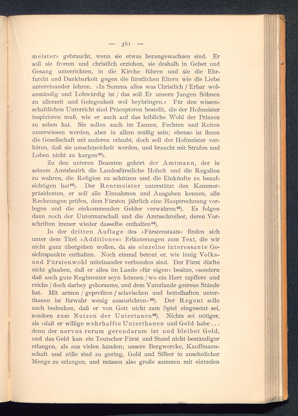 In der dritten Auflage des »Fürstenstaats« finden sichunter dem Titel »Additiones« Erläuterungen zum Text, die wirnicht ganz übergehen wollen, da sie einzelne interessante Ge-sichtspunkte enthalten. Noch einmal betont er, wie innig Volks-und Fürstenwohl miteinander verbunden sind. Der Fürst dürftenicht glauben, daß er alles im Lande »für eigen« besitze, »sonderndaß auch gute Regimenter seyn können / wo ein Herr tapffere undreiche / doch darbey gehorsame, und dem Vaterlande getreue Ständehat. Mit armen / gepreßten / sclavischen und bettelhaften unter-thanen ist fürwahr wenig auszurichten« 86 ). Der Regent solleauch bedenken, daß er von Gott nicht zum Spiel eingesetzt sei,sondern zum Nutzen der Untertanen 86 ). Nichts sei nötiger,als »daß er willige wehrhaffte Unterthanen und Geld habe . . .denn der nervus rerum gerendarum ist und bleibet Geld,und das Geld kan ein Teutscher Fürst und Stand nicht beständigererlangen, als aus vielen händen; unsere Bergwercke, Kauffmann-schaft und zolle sind zu gering, Gold und Silber in ansehnlicherMenge zu erlangen, und müssen also große summen mit eintzelen