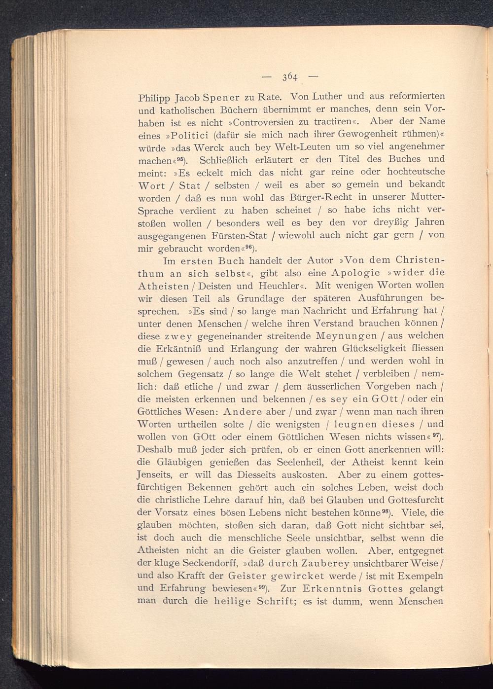 Philipp Jacob Spener zu Rate. Von Luther und aus reformiertenund katholischen Büchern übernimmt er manches, denn sein Vor-haben ist es nicht »Controversien zu tractiren«. Aber der Nameeines »Politici (dafür sie mich nach ihrer Gewogenheit rühmen)«würde »das Werck auch bey Welt-Leuten um so viel angenehmermachen« 96 ). Schließlich erläutert er den Titel des Buches undmeint: »Es eckelt mich das nicht gar reine oder hochteutscheWort / Stat / selbsten / weil es aber so gemein und bekandtworden / daß es nun wohl das Bürger-Recht in unserer Mutter-Sprache verdient zu haben scheinet / so habe ichs nicht ver-stoßen wollen / besonders weil es bey den vor dreyßig Jahrenausgegangenen Fürsten-Stat / wiewohl auch nicht gar gern / vonmir gebraucht worden« 96 ).
