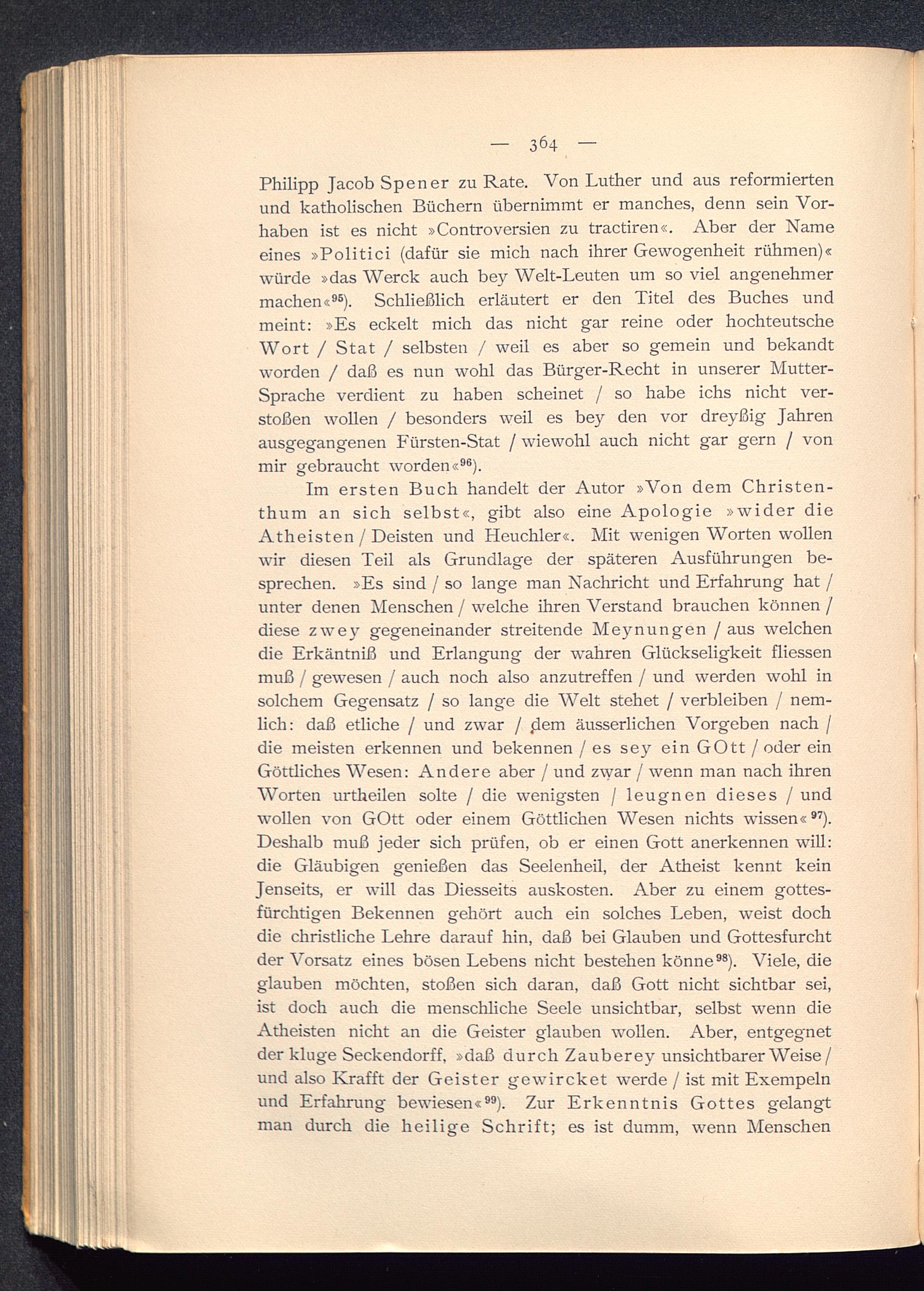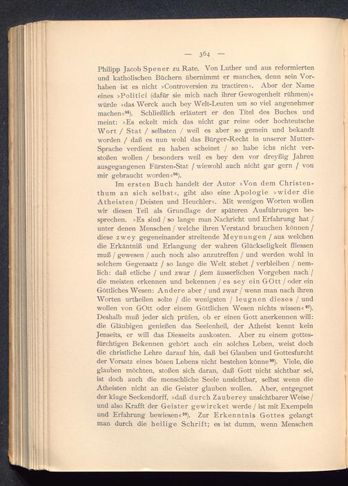 Im ersten Buch handelt der Autor »Von dem Christen-thum an sich selbst«, gibt also eine Apologie »wider dieAtheisten / Deisten und Heuchler«. Mit wenigen Worten wollenwir diesen Teil als Grundlage der späteren Ausführungen be-sprechen. »Es sind / so lange man Nachricht und Erfahrung hat /unter denen Menschen / welche ihren Verstand brauchen können /diese zwey gegeneinander streitende Meynungen / aus welchendie Erkäntniß und Erlangung der wahren Glückseligkeit fliessenmuß / gewesen / auch noch also anzutreffen / und werden wohl insolchem Gegensatz / so lange die Welt stehet / verbleiben / nem-lich: daß etliche / und zwar / dem äusserlichen Vorgeben nach /die meisten erkennen und bekennen / es sey ein GOtt / oder einGötüiches Wesen: Andere aber / und zwar / wenn man nach ihrenWorten urtheilen solte / die wenigsten / leugnen dieses / undwollen von GOtt oder einem Göttlichen Wesen nichts wissen« 97 ).Deshalb muß jeder sich prüfen, ob er einen Gott anerkennen will:die Gläubigen genießen das Seelenheil, der Atheist kennt keinJenseits, er will das Diesseits auskosten. Aber zu einem gottes-fürchtigen Bekennen gehört auch ein solches Leben, weist dochdie christliche Lehre darauf hin, daß bei Glauben und Gottesfurchtder Vorsatz eines bösen Lebens nicht bestehen könne 98 ). Viele, dieglauben möchten, stoßen sich daran, daß Gott nicht sichtbar sei,ist doch auch die menschliche Seele unsichtbar, selbst wenn dieAtheisten nicht an die Geister glauben wollen. Aber, entgegnetder kluge Seckendorff, »daß durch Zauberey unsichtbarerWeise/und also Krafft der Geister gewircket werde / ist mit Exempelnund Erfahrung bewiesen« 99 ). Zur Erkenntnis Gottes gelangtman durch die heilige Schrift; es ist dumm, wenn Menschen