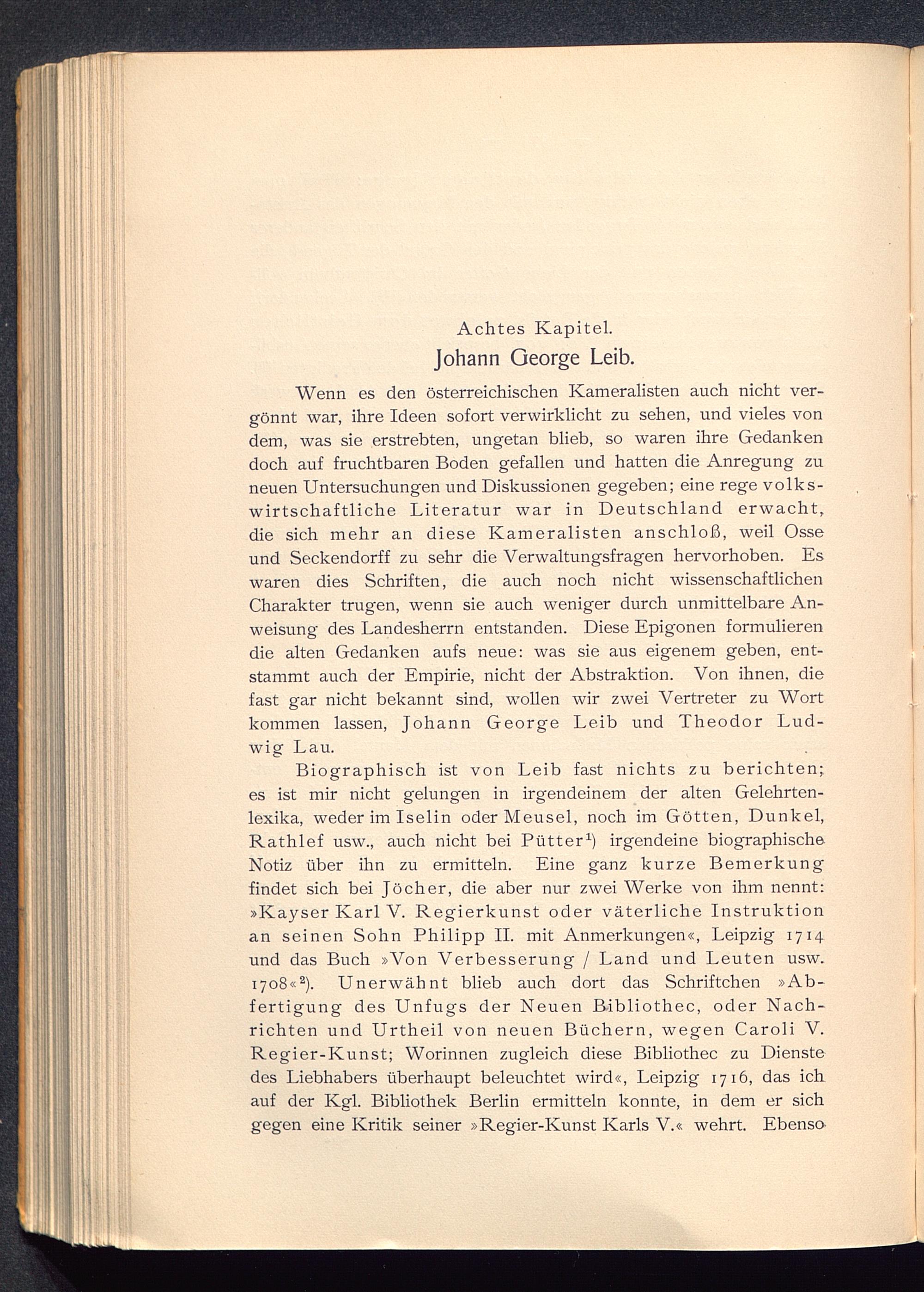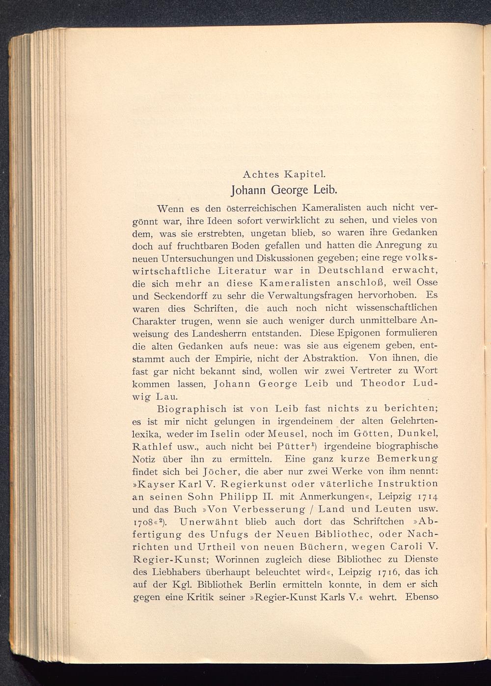 Wenn es den österreichischen Kameralisten auch nicht ver-gönnt war, ihre Ideen sofort verwirklicht zu sehen, und vieles vondem, was sie erstrebten, ungetan blieb, so waren ihre Gedankendoch auf fruchtbaren Boden gefallen und hatten die Anregung zuneuen Untersuchungen und Diskussionen gegeben; eine rege volks-wirtschaftliche Literatur war in Deutschland erwacht,die sich mehr an diese Kameralisten anschloß, weil Osseund Seckendorff zu sehr die Verwaltungsfragen hervorhoben. Eswaren dies Schriften, die auch noch nicht wissenschaftlichenCharakter trugen, wenn sie auch weniger durch unmittelbare An-weisung des Landesherrn entstanden. Diese Epigonen formulierendie alten Gedanken aufs neue: was sie aus eigenem geben, ent-stammt auch der Empirie, nicht der Abstraktion. Von ihnen, diefast gar nicht bekannt sind, wollen wir zwei Vertreter zu Wortkommen lassen, Johann George Leib und Theodor Lud-wig Lau.