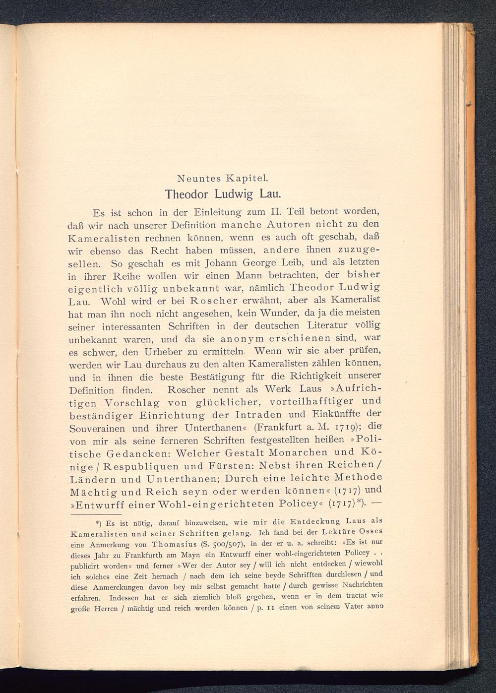 Es ist schon in der Einleitung zum II. Teil betont worden,daß wir nach unserer Definition manche Autoren nicht zu denKameralisten rechnen können, wenn es auch oft geschah, daßwir ebenso das Recht haben müssen, andere ihnen zuzuge-sellen. So geschah es mit Johann George Leib, und als letztenin ihrer Reihe wollen wir einen Mann betrachten, der bishereigentlich völlig unbekannt war, nämlich Theodor LudwigLau . Wohl wird er bei Roscher erwähnt, aber als Kameralisthat man ihn noch nicht angesehen, kein Wunder, da ja die meistenseiner interessanten Schriften in der deutschen Literatur völligunbekannt waren, und da sie anonym erschienen sind, wares schwer, den Urheber zu ermitteln. Wenn wir sie aber prüfen,werden wir Lau durchaus zu den alten Kameralisten zählen können,und in ihnen die beste Bestätigung für die Richtigkeit unsererDefinition finden. Roscher nennt als Werk Laus »Aufrich-tigen Vorschlag von glücklicher, vorteilhafftiger undbeständiger Einrichtung der Intraden und Einkünffte derSouverainen und ihrer Unterthanen« (Frankfurt a. M. 1719); dievon mir als seine ferneren Schriften festgestellten heißen »Poli-tische Gedanclcen: Welcher Gestalt Monarchen und Kö-nige / Respubliquen und Fürsten : Nebst ihren Reichen/Ländern und Unterthanen; Durch eine leichte MethodeMächtig und Reich seyn oder werden können« (1717) und»Entwurff einer Wohl-eingerichteten Policey« (1717)*)- —