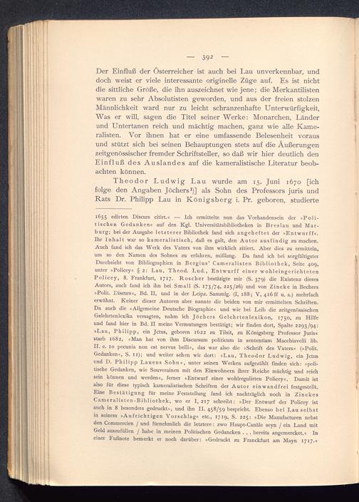 1655 edirten Diseurs citirt.« — Ich ermittelte nun das Vorhandensein der »Poli-tischen Gedanken« auf den Kgl. Universitätsbibliotheken in Breslau und Mar-burg ; bei der Ausgabe letzterer Bibliothek fand sich angeheftet der »Entwurff«.Ihr Inhalt war so kameralistisch, daß es galt, den Autor ausfindig zu machen.Auch fand ich das Werk des Vaters von ihm wirklich zitiert. Aber dies zu ermitteln,um so den Namen des Sohnes zu erfahren, mißlang. Da fand ich bei sorgfältigsterDurchsicht von Bibliographien in Bergius ’ Cameralisten Bibliothek, Seite 409,unter »Policey« § 2: Lau, Theod. Lud., Entwurff einer wohleingerichtetenPolicey, 8. Frankfurt , 1717. Roscher bestätigte mir (S. 379) die Existenz diesesAutors, auch fand ich ihn bei Small (S. 173/74, 225/26) und von Zincke in Bechers»Polit. Diseurs«, Bd. II, und in der Leipz. Sammlg. (I, 188; V, 416 ff u. a.) mehrfacherwähnt. Keiner dieser Autoren aber nannte die beiden von mir ermittelten Schriften.Da auch die »Allgemeine Deutsche Biographie« und wie bei Leib die zeitgenössischenGelehrtenlexika versagten, nahm ich Jöchers Gelehrtenlexikon, 1750, zu Hilfeund fand hier in Bd. II meine Vermutungen bestätigt; wir finden dort, Spalte 2293/94:»Lau, Philipp, ein Jctus, geboren 1622 zu Tilsit , zu Königsberg Professor Juris«starb 1682, »Man hat von ihm Discursum politicum in sententiam Macchiavelli lib.II. c. 10 pecunia non est nervus belli«, das war also die »Schrift des Vaters« (»Polit.Gedanken«, S. 11); und weiter sehen wir dort; »Lau, Theodor Ludwig, ein Jctusund D. Philipp Lauens Sohn«, unter seinen Werken aufgezählt finden sich: »poli-tische Gedanken, wie Souverainen mit den Einwohnern ihrer Reiche mächtig und reichsein können und werden«, ferner »Entwurf einer wohlregulirten Policey«. Damit istalso für diese typisch kameralistischen Schriften der Autor einwandfrei festgestellt.Eine Bestätigung für meine Feststellung fand ich nachträglich noch in ZinckesCameralisten-Bibliothek, wo er I, 217 schreibt: »Der Kntwurf der Policey istauch in 8 besonders gedruckt«, und ihn II. 458/59 bespricht. Ebenso bei Lau selbstin seinem »Aufrichtigen Vorschlag« etc., 1719, S. 225: »Die Manufacturen nebstden Commercien / und fiirnehmlich die letztere: zwo Haupt-Canäle seyn / ein Land mitGeld auszufüllen / habe in meinen Politischen Gedancken . . . bereits angemercket.« Ineiner Fußnote bemerkt er noch darüber: »Gedruckt zu Franckfurt am Mayn 1717.«