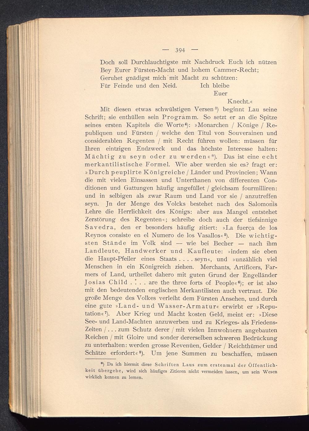 Mit diesen etwas schwülstigen Versen 3 ) beginnt Lau seineSchrift; sie enthüllen sein Programm. So setzt er an die Spitzeseines ersten Kapitels die Worte 4 ): »Monarchen / Könige / Re-publiquen und Fürsten / welche den Titul von Souverainen undconsiderablen Regenten / mit Recht führen wollen: müssen fürIhren eintzigen Endzweck und das höchste Interesse halten:Mächtig zu seyn oder zu werden«*). Das ist eine echtmerkantilistische Formel. Wie aber werden sie es? fragt er:»Durch peuplirte Königreiche / Länder und Provincien; Wanndie mit vielen Einsassen und Unterthanen von differenten Con-ditionen und Gattungen häufig angefüllet / gleichsam fourmilliren:und in selbigen als zwar Raum und Land vor sie / anzutreffenseyn. Jn der Menge des Volcks bestehet nach des SalomonisLehre die Herrlichkeit des Königs: aber aus Mangel entstehetZerstörung des Regenten«; schreibe doch auch der tiefsinnigeSavedra, den er besonders häufig zitiert: »La fuerqa de losReynos consiste en el Numero de los Vasallos« 6 ). Die wichtig-sten Stände im Volk sind — wie bei Becher — nach ihmLandleute, Handwerker und Kaufleute: »indem sie ebendie Haupt-Pfeiler eines Staats .... seyn«, und »unzählich vielMenschen in ein Königreich ziehen. Merchants, Artificers, Far-mers of Land, urtheilet dahero mit guten Grund der EngelländerJosias Child . ! . . are the three forts of People« 6 ); er ist alsomit den bedeutenden englischen Merkantilisten auch vertraut. Diegroße Menge des Volkes verleiht dem Fürsten Ansehen, und durcheine gute »Land- und Wasser-Armatur« erwirbt er »Repu-tation« 7 ). Aber Krieg und Macht kosten Geld, meint er: »DieseSee- und Land-Machten anzuwerben und zu Krieges- als Friedens-Zeiten / . . . zum Schutz derer / mit vielen Innwohnern angebautenReichen / mit Gloire und sonder dererselben schweren Bedrückungzu unterhalten: werden grosse Revenüen, Gelder / Reichthümer undSchätze erfordert« 8 ). Um jene Summen zu beschaffen, müssen
