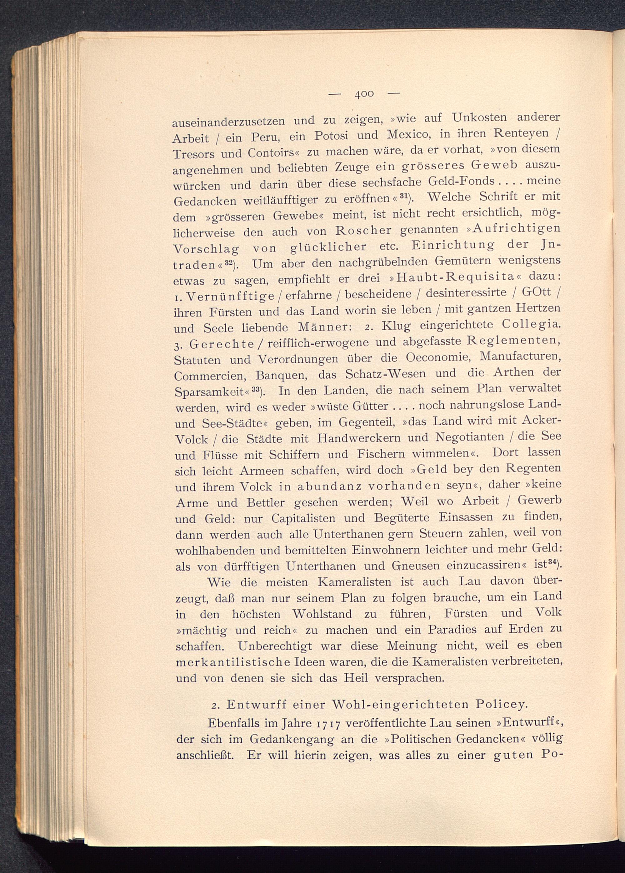 auseinanderzusetzen und zu zeigen, »wie auf Unkosten andererArbeit / ein Peru, ein Potosi und Mexico , in ihren Renteyen /Tresors und Contoirs« zu machen wäre, da er vorhat, »von diesemangenehmen und beliebten Zeuge ein grösseres Ge web auszu-würcken und darin über diese sechsfache Geld-Fonds .... meineGedancken weitläufftiger zu eröffnen« 31 ). Welche Schrift er mitdem »grösseren Gewebe« meint, ist nicht recht ersichtlich, mög-licherweise den auch von Roscher genannten »AufrichtigenVorschlag von glücklicher etc. Einrichtung der Jn-traden« 32 ). Um aber den nachgrübelnden Gemütern wenigstensetwas zu sagen, empfiehlt er drei »Haubt-Requisita« dazu:i. Vernünfftige /erfahrne / bescheidene / desinteressirte / GOtt / ihren Fürsten und das Land worin sie leben / mit gantzen Hertzenund Seele liebende Männer: 2. Klug eingerichtete Collegia.