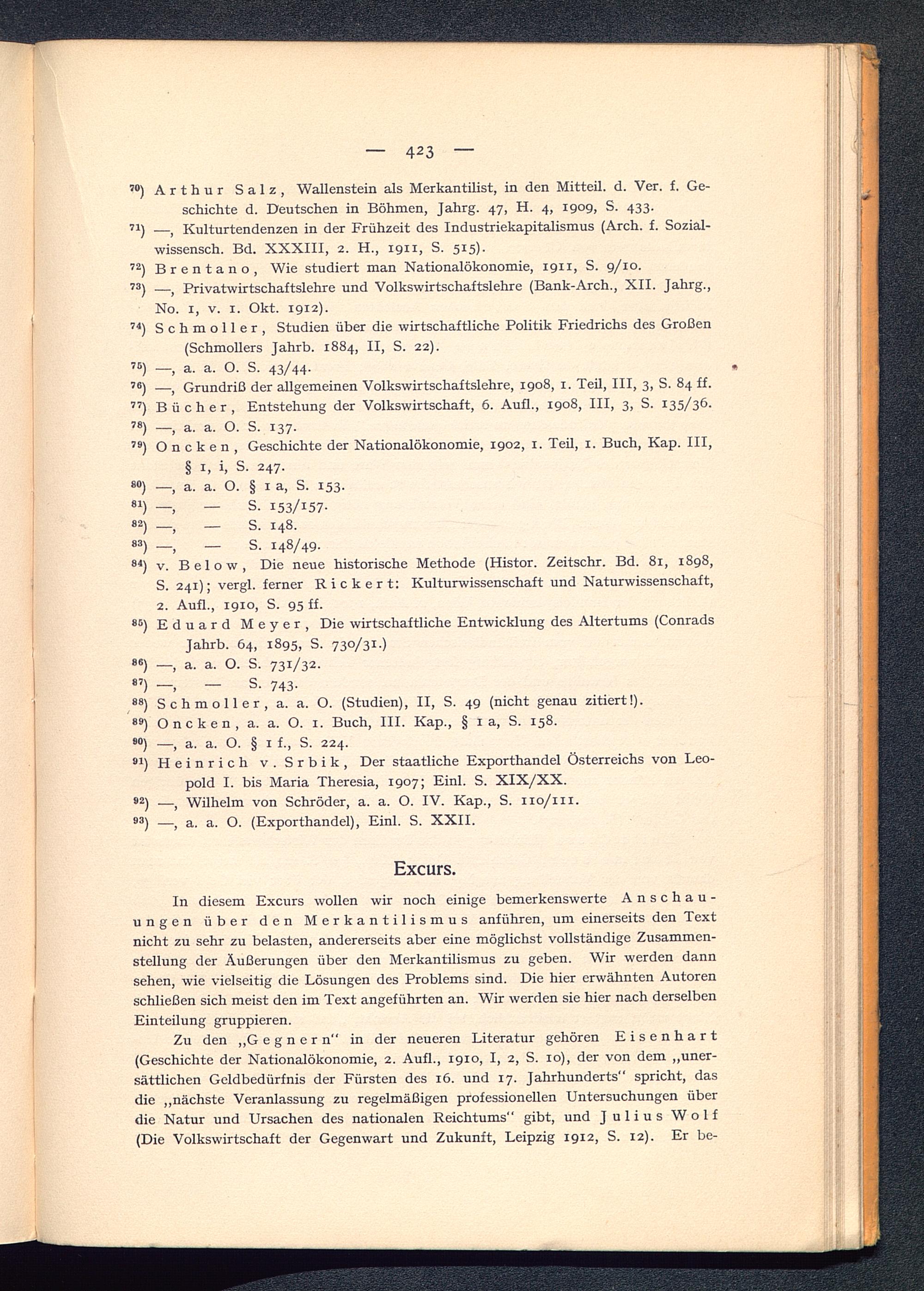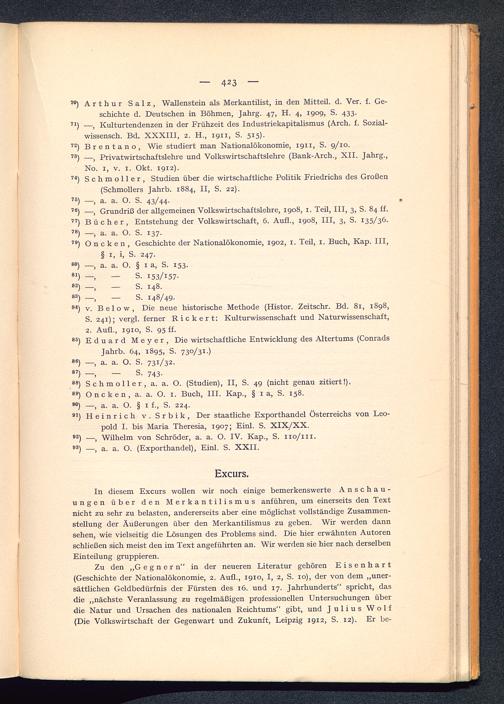 In diesem Excurs wollen wir noch einige bemerkenswerte Anschau-ungen über den Merkantilismus anführen, um einerseits den Textnicht zu sehr zu belasten, andererseits aber eine möglichst vollständige Zusammen-stellung der Äußerungen über den Merkantilismus zu geben. Wir werden dannsehen, wie vielseitig die Lösungen des Problems sind. Die hier erwähnten Autorenschließen sich meist den im Text angeführten an. Wir werden sie hier nach derselbenEinteilung gruppieren.