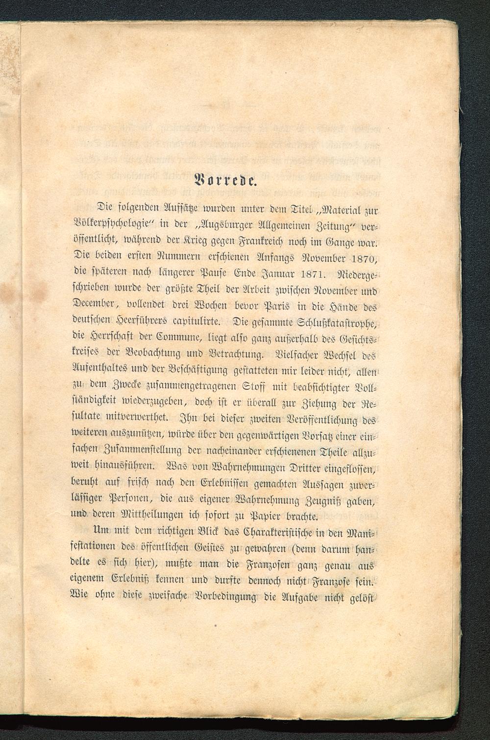 Die folgenden Aufsätze wurden unter dein Titel „Material zurVölkerpsychologie" iu der „Augsburger Allgemeinen Zeitung" ver-öffentlicht, während der Krieg gegen Frankreich noch im Gange war.Die beiden ersten Nummern erschienen Anfangs November 1870,die späteren nach längerer Pause Ende Januar 1871, Niederge-schrieben wurde der größte Theil der Arbeit zwischen November nndDeeember, vollendet drei Wvcben bevor Paris in die Hände desdeutschen Heerführers eapitulirte. Die gesammte Schlußkatastrophe,die Herrschaft der Commune, liegt also ganz außerhalb des Gesichts-kreises der Beobachtung und Betrachtung. Vielfacher Wechsel desAufenthaltes und der Beschäftigung gestatteten mir leider nicht, allenzu- dem Zwecke zusammengetragenen Stoff mit beabsichtigter Voll-ständigkeit wiederzugeben, dock ist er überall zur Ziehung der Re-sultate mitverwerthet. Ihn bei dieser zweiten Veröffentlichung desweiteren auszunützen, würde über den gegenwärtigen Vorsatz einer ein-fachen Zusammenstellung der nacheinander erschienenen Theile allzu-weit hinausführen. Was von Wahrnehmungen Dritter eingeflvssen,beruht auf frisch nach den Erlebnissen gemaebten Aussageu zuver-lässiger Personen, die aus eigener Wahrnehmung Zeugniß gaben,und deren Mittheilungen ich sofort zu Papier brachte.