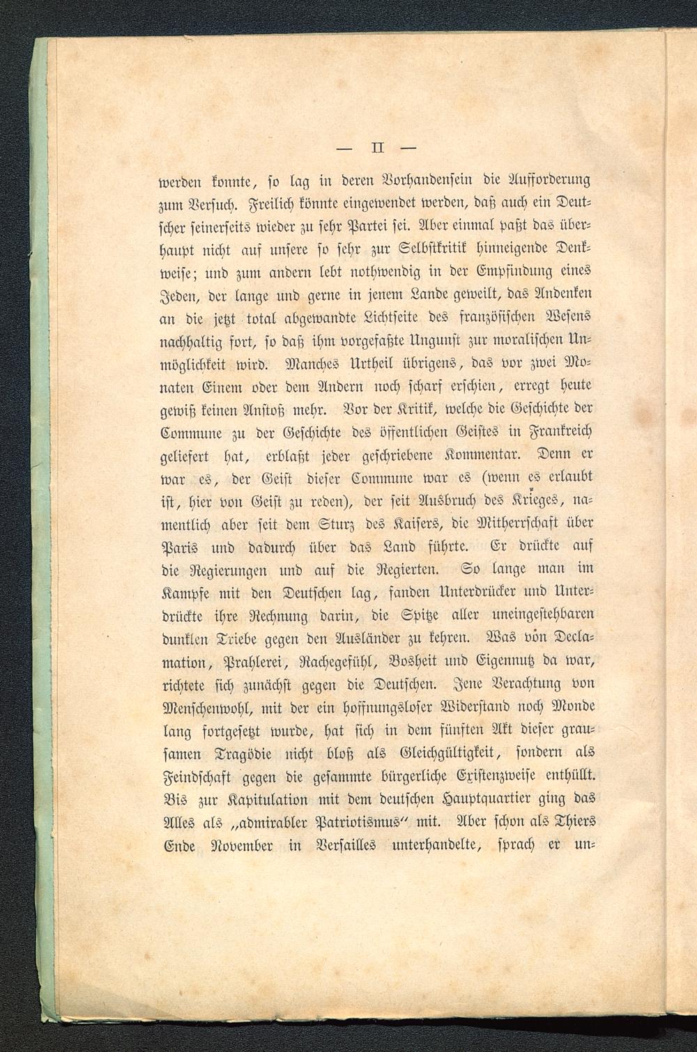 werden konnte, so lag in deren Vorhandensein die Aufforderungzum Versuch. Freilich konnte eingewendet werden, daß auch ein Deut-scher seinerseits wieder zu sehr Partei sei. Aber einmal paßt das über-haupt nicht auf uusere so sehr zur Selbstkritik hinneigende Denk-weise; und zum andern lebt nothwendig in der Empsiuduug einesJeden, der lange uud gerne in jenem Lande geweilt, das Andenkenan die jetzt total abgewandte Lichtseite des französischen Wesensnachhaltig fort, so daß ihm vorgefaßte Unguust zur moralischen Un-möglichkeit wird. Manches Urtheil übrigens, das vor zwei Mo-naten Einem oder dem Andern noch scharf erschien, erregt heutegewiß keiueu Anstoß mehr. Vor der Kritik, welche die Geschichte derCommuue zu der Geschichte des öffentlichen Geistes in Frankreich geliefert bat, erblaßt jeder geschriebene Kommentar. Denn erwar es, der Geist dieser Commnne war es (wenn es erlaubtist, hier vou Geist zu reden), der seit Ausbruch des Krieges, na-mentlich aber seit dem Sturz des Kaisers, die Mitherrschaft überParis und dadurch über das Laud führte. Er drückte aufdie Regierungen und auf die Regierten. So lange man imKampfe mit den Deutschen lag, fanden Unterdrücker und Unter-drückte ihre Rechnung darin, die Spitze aller uneingestehbarendunkleu Triebe gegen den Ausländer zu kehreu. Was vön Decla-matiou, Prahlerei, Rachegefühl, Bosheit und Eigennutz da war,richtete sich zunächst gegen die Deutschen . Jene Verachtung vonMenschenwohl, mit der ein hoffnungsloser Widerstand noch Mondelang fortgesetzt wurde, hat sich iu dem fünften Akt dieser grau-samen Tragödie nicht bloß als Gleichgültigkeit, sondern alsFeindschaft gegen die gesammte bürgerliche Existenzweise enthüllt.Bis zur Kapitulation mit dem deutschen Hauptquartier ging dasAlles als „admirabler Patriotismus" mit. Aber schou als ThiersEude November in Versailles unterhandelte, sprach er un-