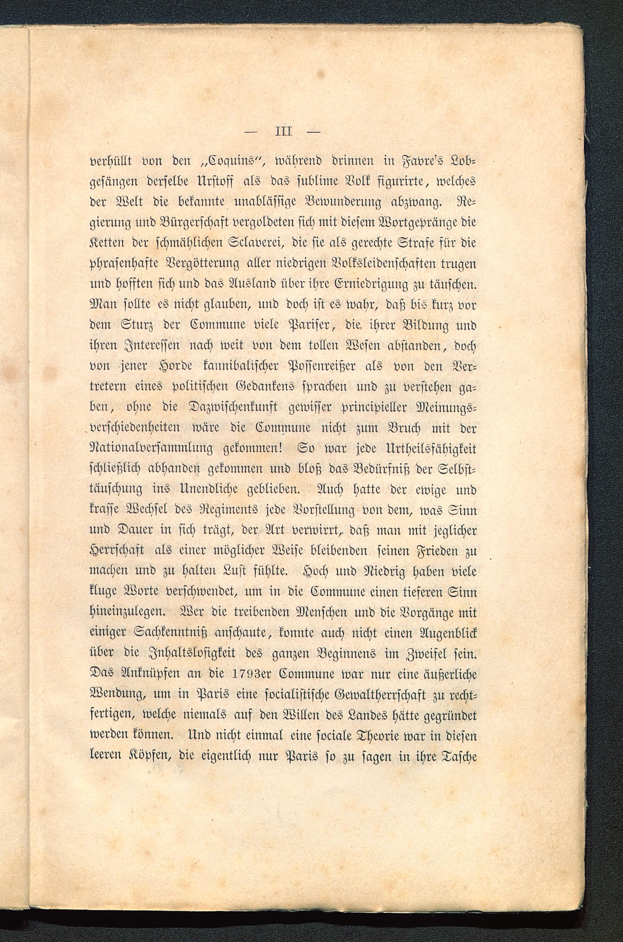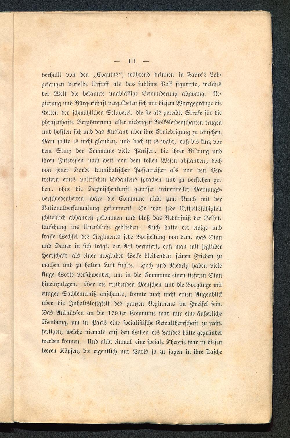 verhüllt von den „Cvquius", während drinnen in Favre's Lob-gesängen derselbe Urstoff als das sublime Volk figurirte, welchesder Welt die bekannte unablässige Bewunderung abzwang. Re-gierung und Bürgerschaft vergoldeten sich mit diesem Wortgepränge dieKetten der schmählichen Sclaverei, die sie als gerechte Strase für diephrasenhafte Vergötterung aller niedrigen Volksleidenschaften trugenund hofften sich nnd das Ausland über ihre Erniedrigung zu tauschen.Man sollte es nicht glauben, uud doch ist es wahr, daß bis kurz vordem Sturz der Commune viele Pariser , die ihrer Bildung undihren Juteressen nach weit von dem tollen Wesen abstanden, dochvon jener Horde kannibalischer Possenreißer als von den Ver-tretern eines politischen Gedankens sprachen und zu verstehen ga-ben, ohne die Dazwischenkamst gewisser principieller Meinungs-verschiedenheiten wäre die Commnne nicht zum Bruch mit derNationalversammlung gekommen! So war jede Urtheilsfäbigkeitschließlich abhanden gekommen und bloß das Bedürfniß der Selbst-täuschung ins Unendliche geblieben. Auch hatte der ewige undkrasse Wechsel des Regiments jede Vorstellung von dem, was Sinnund Dauer in sich trägt, der Art verwirrt^ daß man mit jeglicherHerrschaft als einer möglicher Weise bleibenden seinen Frieden zumachen und zu halten Lust fühlte. Hoch und Niedrig haben vieleklnge Worte verschwendet, um in die Commune einen tieferen Sinnhineinzulegen. Wer die treibenden Menschen und die Vorgänge miteiniger Sachkenntniß anschaute, konnte auch uicht einen Augenblicküber die Inhaltslosigkeit des ganzen Beginnens im Zweifel sein.Das Anknüpfen an die 1793er Commune war nur eine äußerlicheWenduug, um in Paris eine socialistische Gewaltherrschaft zu recht-fertigen, welche niemals auf den Willen des Landes hätte gegründetwerden können. Und nicht einmal eine sociale Theorie war in diesenleeren Köpfen, die eigentlich nur Paris so zu sagen in ihre Tasche
