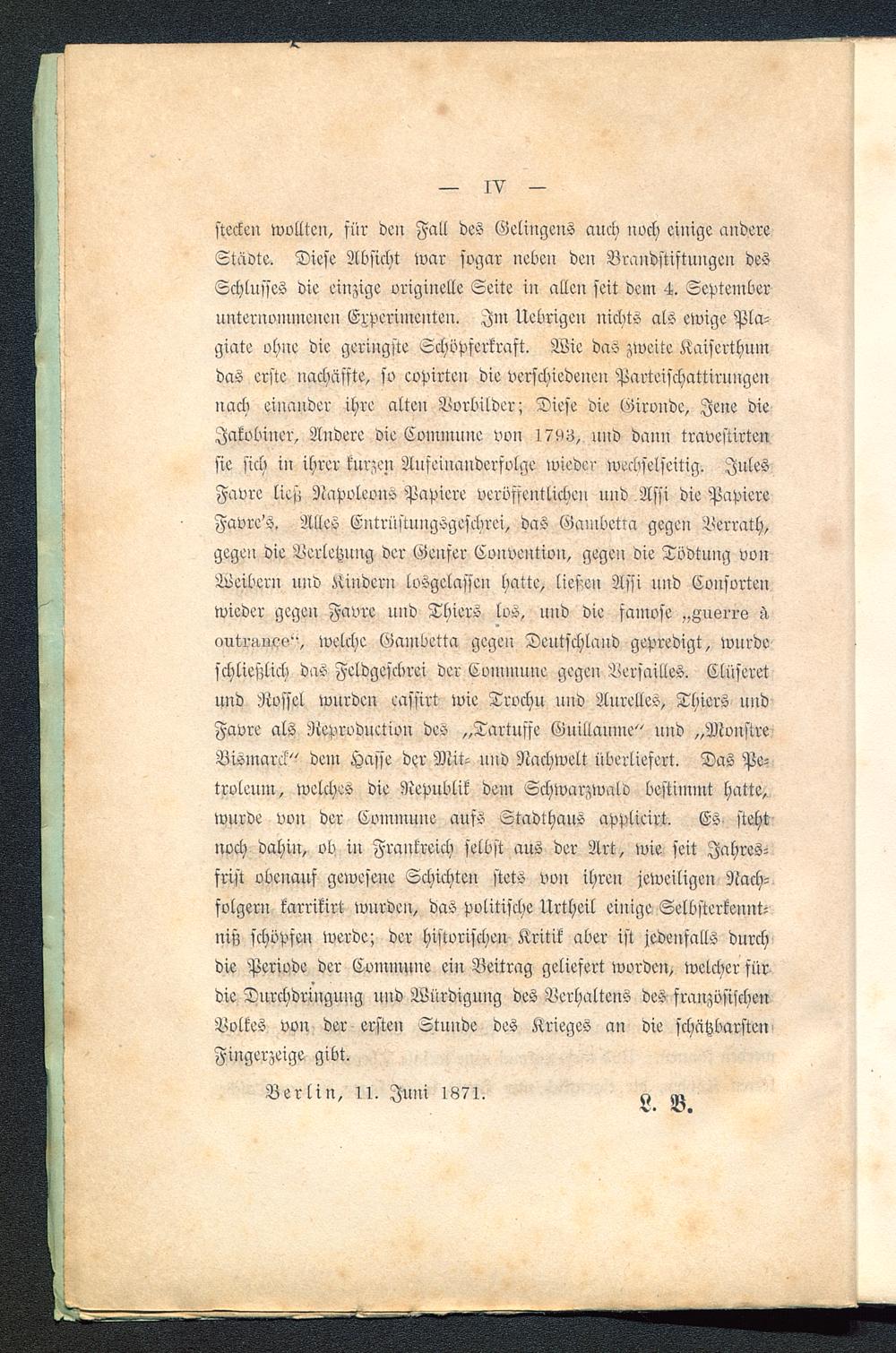 stecken wollten, für den Fall des Gelingens auch noch einige andereStaate. Diese Absicht war sogar neben den Brandstiftungen desSchlusses die einzige originelle Seite in allen seit dem 4. Septemberunternommenen Erperiinenten. Im Uebrigen nichts als ewige Pla-giate ohne die geringste Schöpferkraft. Wie das zweite Kaiserthumdas erste nachäffte, so eopirten die verschiedenen Parteischattirungennach einander ihre alten Vorbilder; Diese die Girvnde, Jene dieJakobiner, Andere die Commune von 1793, und dann travestirtensie sich in ihrer kurzen Aufeinanderfolge wieder wechselseitig. JulesFavre lies; Napoleons Papiere veröffentlichen und . Assi die PapiereFavre'S. Alles Entrüstungsgeschrei, das Gambetra gegen Verrath,gegen die Verletzung der Genfer Convention , gegen die Tödtnng vonWeibern und Kindern losgelassen hatte, ließen Assi und Consvrtenwieder gegen Favre und Thiers los, lind die famose „gusri-s A,nutrÄuc«?", welche Gambetta gegen Deutschland gepredigt, wnrdeschließlich das Feldgeschrei der Commune gegen Versailles . Clüseretund Rössel wurden eassirt wie Trochu und AurelleS, Thiers undFavre als Neproduetiou des „Tartuffe Guillaume" und „MvustreBismarck" dem Hasse der Mit- lind Nachwelt überliefert. Das Pe-troleum, welches die Republik dein Schwarzwald bestimmt hatte,wurde voll der Commune aufs Stadthaus applieirt. Es stehtnoch dahin, ob iu Frankreich selbst aus der Art, wie seit Jahres-frist obenauf geweseue Schichten stets von ihren jeweiligen Nach-folgern karrikirt wurden, das politische Urtheil einige Selbsterkennt-niß schöpfe» werde; der historischen Kritik aber ist jedenfalls durchdie Periode der Commune ein Beitrag geliefert worden, welcher fürdie Durchdringung und Würdigung des Verhaltens des französischen Volkes von der ersten Stunde des Krieges au die schätzbarstenFingerzeige gibt.