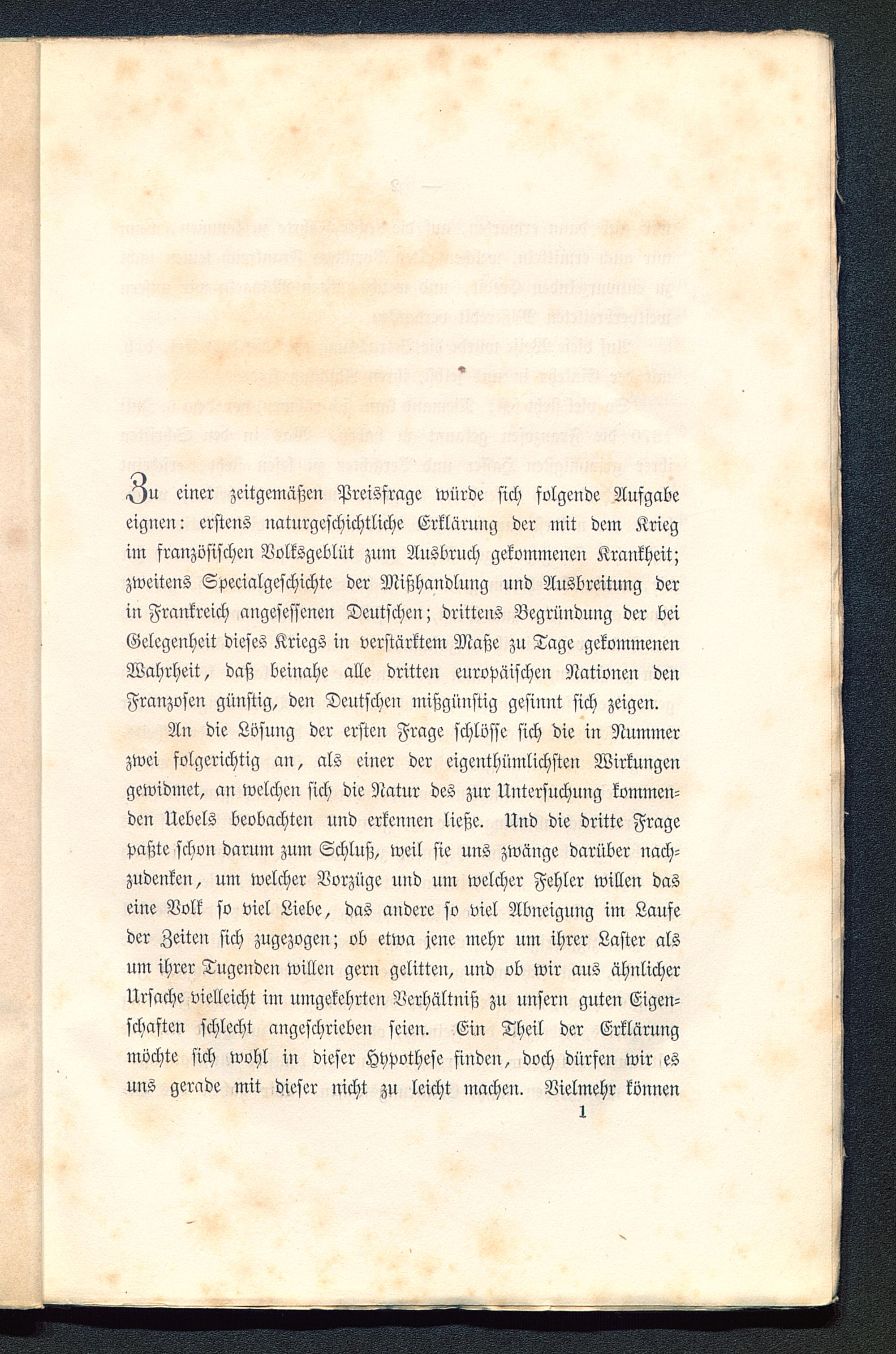 u einer Zeitgemäßen Preisfrage würde sich folgende Aufgabeeignen: erstens naturgeschichtliche Erklärung der mit dem Kriegim französischen Volksgeblüt zum Ausbrnch gekommenen Krankheit;zweitens Specialgeschichte der Mißhandlung und Ausbreitung derin Frankreich angesessenen Deutschen; drittens Begründung der beiGelegenheit dieses Kriegs in verstärktem Maße zu Tage gekommenenWahrheit, daß beinahe alle dritten europäischen Nationeu denFrauzosen günstig, den Deutschen mißgünstig gesinnt sich zeigen.