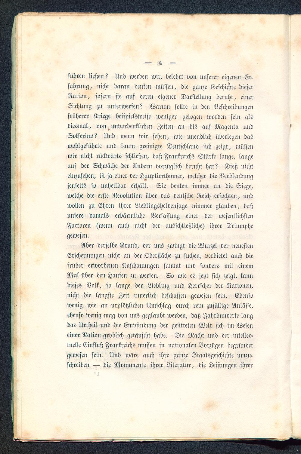 führeil ließen? Und werden wir, belehrt von unserer eigenen Er-fahrung, nicht daran denken müssen, die ganze Geschichte dieserNation, sofern sie auf deren eigener Darstellung beruht, eiuerSichtung zu unterwerfen? Warum sollte in den Beschreibungenfrüherer Kriege beispielsweise weniger gelogen worden sein alsdiesmal, von. unvordenklichen Zeiten an bis auf Magenta undSolferino? Und wenn wir fehen, wie unendlich überlegen daswohlgeführte uud kaum geeiuigte Deutschland sich zeigt, müssenwir nicht rückwärts schließen, daß Frankreichs Stärke lange, langeauf der Schwäche der Auderu vorzüglich beruht hat? Dieß nichteinzusehen, ist ja einer der Hauptirrthümer, welcher die Verblendungjenseits so unheilbar erhält. Sie denken immer an die Siege,welche die erste Revolution über das deutsche Reich erfochten, undwollen zu Ehren ihrer Lieblingsheldensage nimmer glauben, daßuusere damals erbärmliche Verfassung einer der wesentlichstenFaetoren (wenn auch nicht der ausschließliche) ihrer Triumphegewesen.