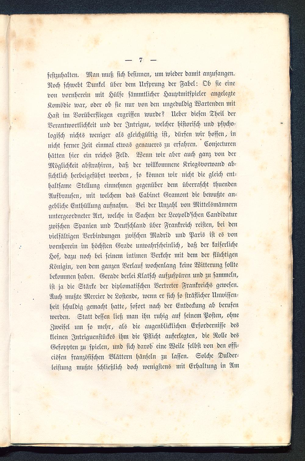 festzuhalten. Man muß sich besinnen, um wieder damit anzufangen.Noch schwebt Dunkel über dem Ursprung der Fabel: Ob sie einevon vornherein mit Hülfe sämmtlicher Hauptmitspieler augelegteKomödie war, oder ob sie nur vou den ungeduldig Wartenden mitHast im Vorübersliegen ergriffen wurde? Ueber dieseu Theil derVerantwortlichkeit und der Intrigue, welcher historisch uud psycho-logisch nichts weniger als gleichgültig ist, dürfen wir hoffen, innicht ferner Zeit einmal etwas genaueres zu erfahren. Conjccturenhätten hier eiu reiches Feld. Weun wir aber auch gauz von derMöglichkeit abstrahiren, daß der willkommene Kriegsvorwand ab-sichtlich herbeigeführt worden, so können wir nicht die gleich ent-haltsame Stellung einnehmen gegenüber dem überrascht thuendenAufbrausen, mit welchem das Cabinet Gramont die bewußte an-gebliche Enthüllung aufnahm. Bei der Unzahl von Mittelsmännernuntergeordneter Art, welche in Sachen der Leopold'schen Candidaturzwischen Spanien uud Deutschland über Frankreich reisten, bei denvielfältigen Verbindungen zwischen Madrid und Paris ist es vonvornherein im höchsten Grade unwahrscheinlich, daß der kaiserlicheHof, dazu noch bei seinem intimen Verkehr mit dem der flüchtigenKönigin, von dem ganzen Verlauf wochenlang keine Witterung solltebekommen haben. Gerade derlei Klatsch aufzuspüren und zu sammeln,ist ja die Stärke der diplomatischen Vertreter Frankreichs gewesen.Auch mußte Mereier de Lostende, wem: er sich so sträflicher Unwissen-heit schuldig gemacht hatte, sofort nach der Entdeckung ab berufenwerden. Statt dessen ließ man ihn ruhig auf seinem Posten, ohneZweifel um so mehr, als die augenblicklichen Erfordernisse deskleinen Jntriguenstückes ihm die Pflicht auserlegteu, die Rolle desGefoppteu zu spielen, und sich darob' eine Weile selbst von den offi-eiösen französischen Blättern hänseln zu lassen. Solche Dulder-leistung mußte schließlich doch wenigstens mit Erhaltung in Am