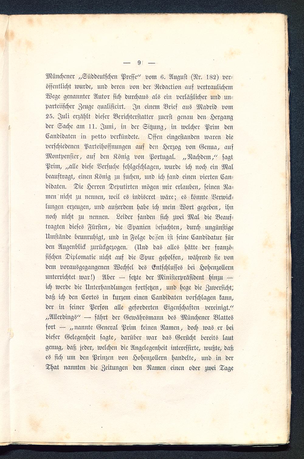 Münchener „Süddeutschen Presse" vom 6. August (Nr. 182) ver-öffentlicht wurde, uud deren von der Redaetion auf vertraulichemWege genannter Autor sich durchaus als ein verläßlicher und un-parteiischer Zeuge qualificirt. In einem Brief aus Madrid vom25. Juli erzählt dieser Berichterstatter zuerst genau den Hergangder Sache am 11. Juni, in der Sitzung, in welcher Prim denCandidateu in petto verkündete. Offen eingestanden waren dieverschiedenen Parteihoffnungen auf den Herzog von Genua , aufMontvensier, auf den König von Portugal . „Nachdem," sagtPrim, „alle diese Versuche fehlgeschlagen, wurde ich noch ein Malbeauftragt, einen König zu suchen, und ich fand einen vierten Kan-didaten. Die Herren Deputirten mögen mir erlauben, seinen Na-men nicht zu ucunen, weil es inoiseret wäre; es könnte Verwick-lungen erzeugen, und außerdem habe ich mein Wort gegeben, ihnnoch nicht zu nennen. Leider fanden sich zwei Mal die Beauf-tragten dieses Fürsten, die Spanien besuchten, durch ungünstigeUmstände beunruhigt, und in Folge dessen ist seine Kandidatur fürden Augenblick zurückgezogen. (Und das alles hätte der franzö-sischen Diplomatie nicht auf die Spur geholfen, während sie vondem vorausgegangenen Wechsel des Entschlusses bei Hoheuzolleruunterrichtet war!) Aber — setzte der Ministerpräsident hiuzu —ich werde die Unterhandlungen fortsetzen, und hege die Zuversicht!daß ich den Cortes in kurzein einen Kandidaten vorschlagen kann,der in seiner Person alle geforderten Eigenschaften vereinigt."„Allerdings" — fährt der Gewährsmann des Münchener Blattesfort — „nannte General Prim keinen Namen, doch was er beidieser Gelegenheit sagte, darüber war das Gerücht bereits lautgeuug, daß jeder, welchen die Angelegenheit interessirte, wußte, daßes sich um den Prinzen von Hohenzollern handelte, nnd in derThat nannten die Zeitungen den Namen einen oder zwei Tage