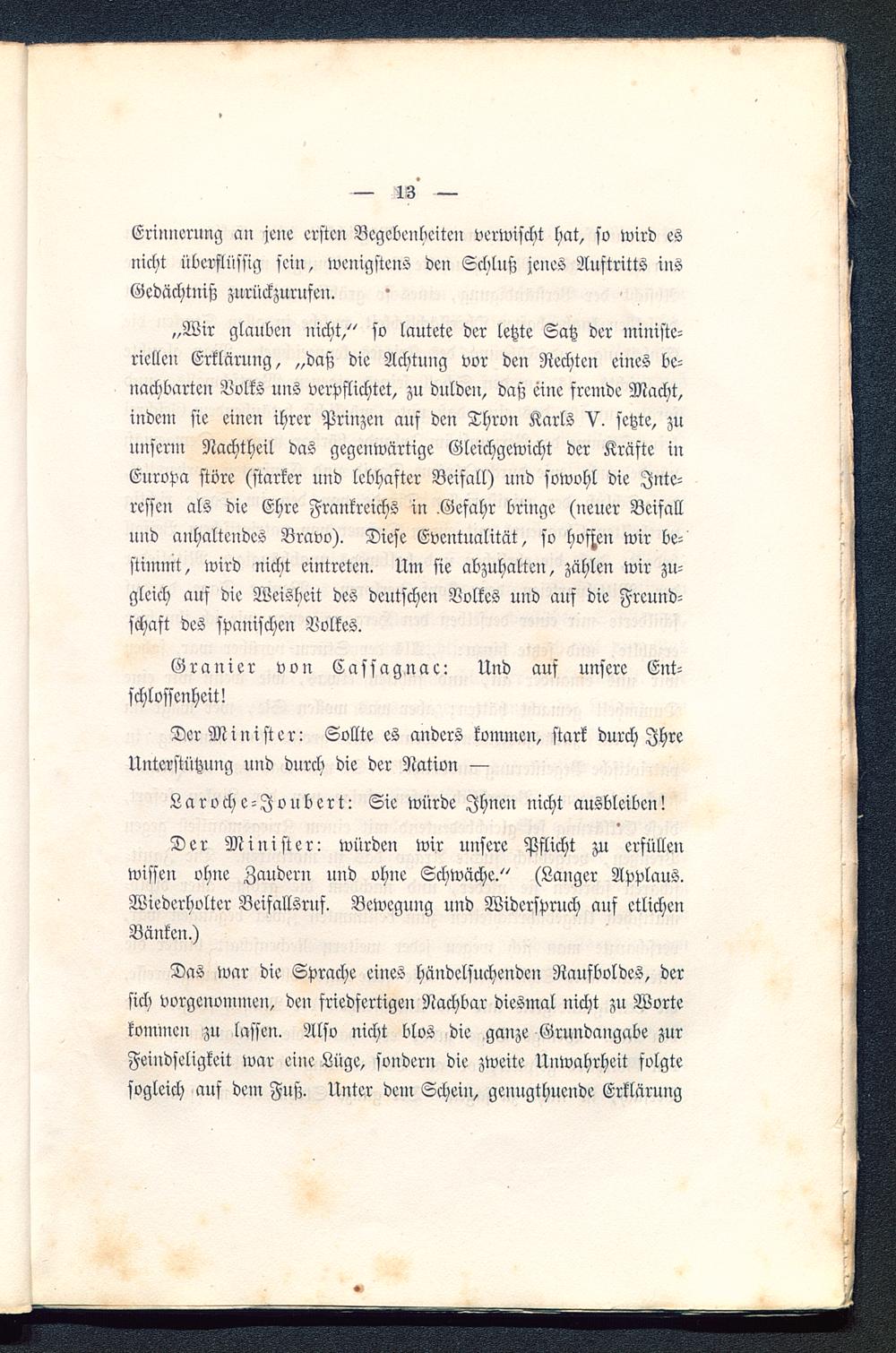 „Wir glauben nicht," so lautete der letzte Satz der ministe-riellen Erklärung, „daß die Achtung vor den Rechten eines be-nachbarten Volks uus verpflichtet, zu dulden, daß eine fremde Macht,indem sie einen ihrer Prinzen auf den Thron Karls V. setzte, zuunserm Nachtheil das gegenwärtige Gleichgewicht der Kräfte inEuropa störe (starker und lebhafter Beifall) und sowohl die Inte-ressen als die Ehre Frankreichs in.Gefahr bringe (neuer Beifallund anhaltendes Bravo). Diese Eventualität, so hofften wir be-stimmt, wird nicht eintreten. Um sie abzuhalten, zählen wir zu-gleich auf die Weisheit des deutschen Volkes und auf die Freund-schaft des spanischen Volkes.