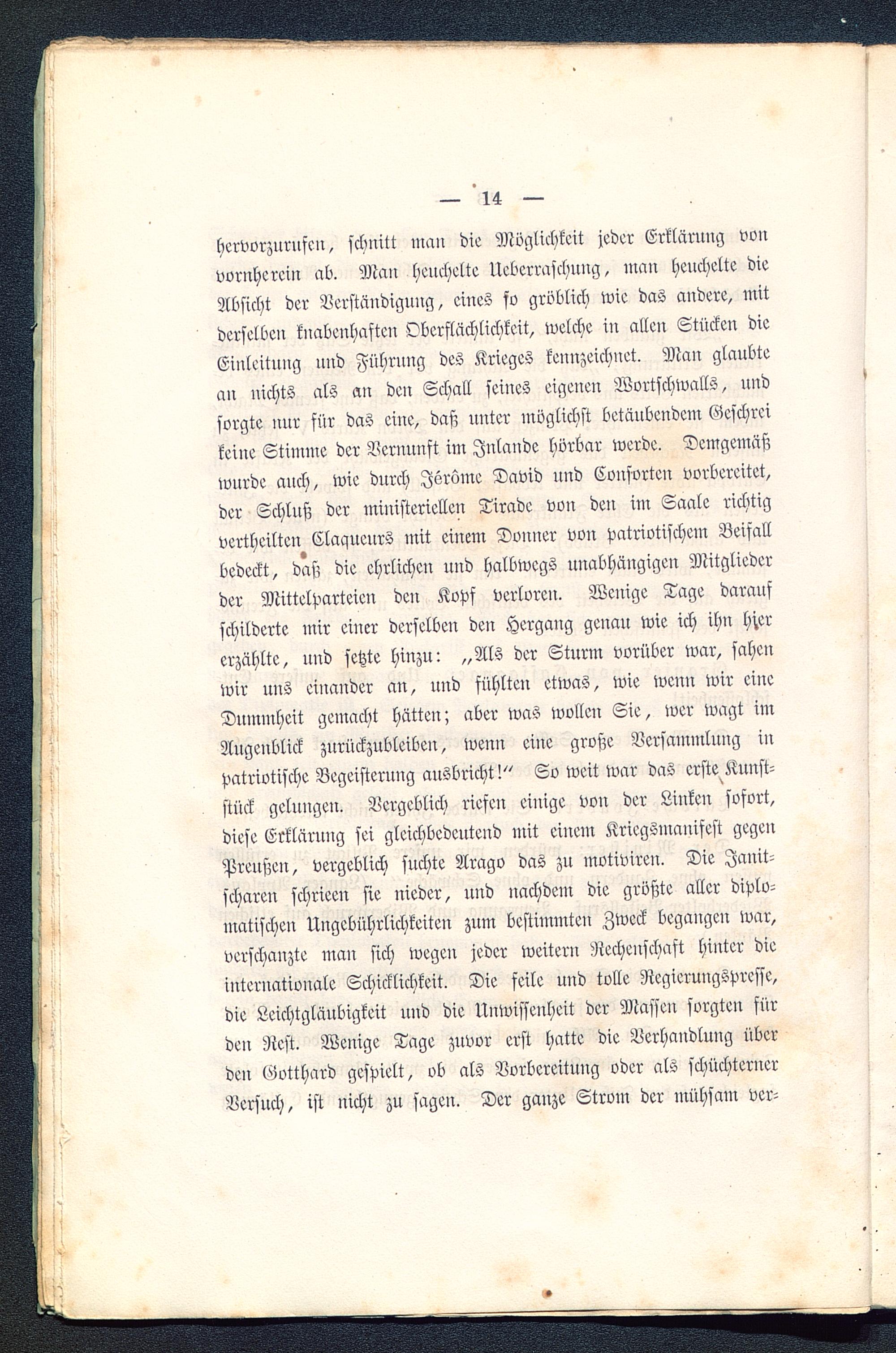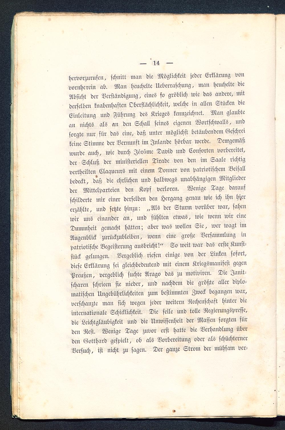 hervorzurufen, schnitt man die Möglichkeit jeder Erklärung vonvornherein ab. Man heuchelte Uebcrraschnng, man heuchelte dieAbsicht der Verständigung, eines so gröblich wie das andere, mitderselben knabenhaften Oberflächlichkeit, welche in allen Stücken dieEinleitung und Führung des Krieges kennzeichnet. Mau glaubtean nichts als an dcu Schall seines eigenen Wortschwalls, undsorgte nur für das eine, daß unter möglichst betäubendem Geschreikeine Stimme der Vernunft im Jnlande hörbar werde. Demgemäßwnrde auch, wie durch Jsrüme David und Conforten vorbereitet,der Schluß der ministeriellen Tirade von den in: Saale richtigvertheilte!? Claqueurs mit einem Douner von patriotischein Beifallbedeckt, daß die ehrlichen und halbwegs unabhängigen Mitgliederder Mittelparteien den Kopf verloren. Wenige Tage daraufschilderte mir einer derselben den Hergang genau wie ich ihn hi.ererzählte, und fetzte hinzu: „Als der Sturm vorüber war, sahenwir uns einander an, und fühlten etwas, wie wenn wir eineDummheit gemacht hätten; aber was wollen Sie, wer wagt imAligenblick zurückzubleiben, wenn eine große Versammlung inpatriotische Begeisterung ausbricht!" So weit war das erste^Kunst-stück gelungen. Vergeblich riefen einige von der Linken sofort,diese Erklärung sei gleichbedeutend mit einem Kriegsmanifest gegenPreußen, vergeblich suchte Arago das zu motiviren. Die Janit-scharen schrieen sie nieder, und nachdem die größte aller diplo-matischeil Ungebührlichkeiteu zum bestimmten Zweck begangeil war,verschanzte man sich wegeil jeder weitern Rechenschaft hinter dieinternationale Schicklichkeit. Die feile und tolle Ncgieruugspresse,die Leichtgläubigkeit und die Unwissenheit der Massen sorgten fürden Nest. Wenige Tage zuvor erst hatte die Verhandlung überden Gvtthard gespielt, ob als Vorbereitung oder als schüchternerVersuch, ist nicht zu sageil. Der ganze Strom der mühsam der-