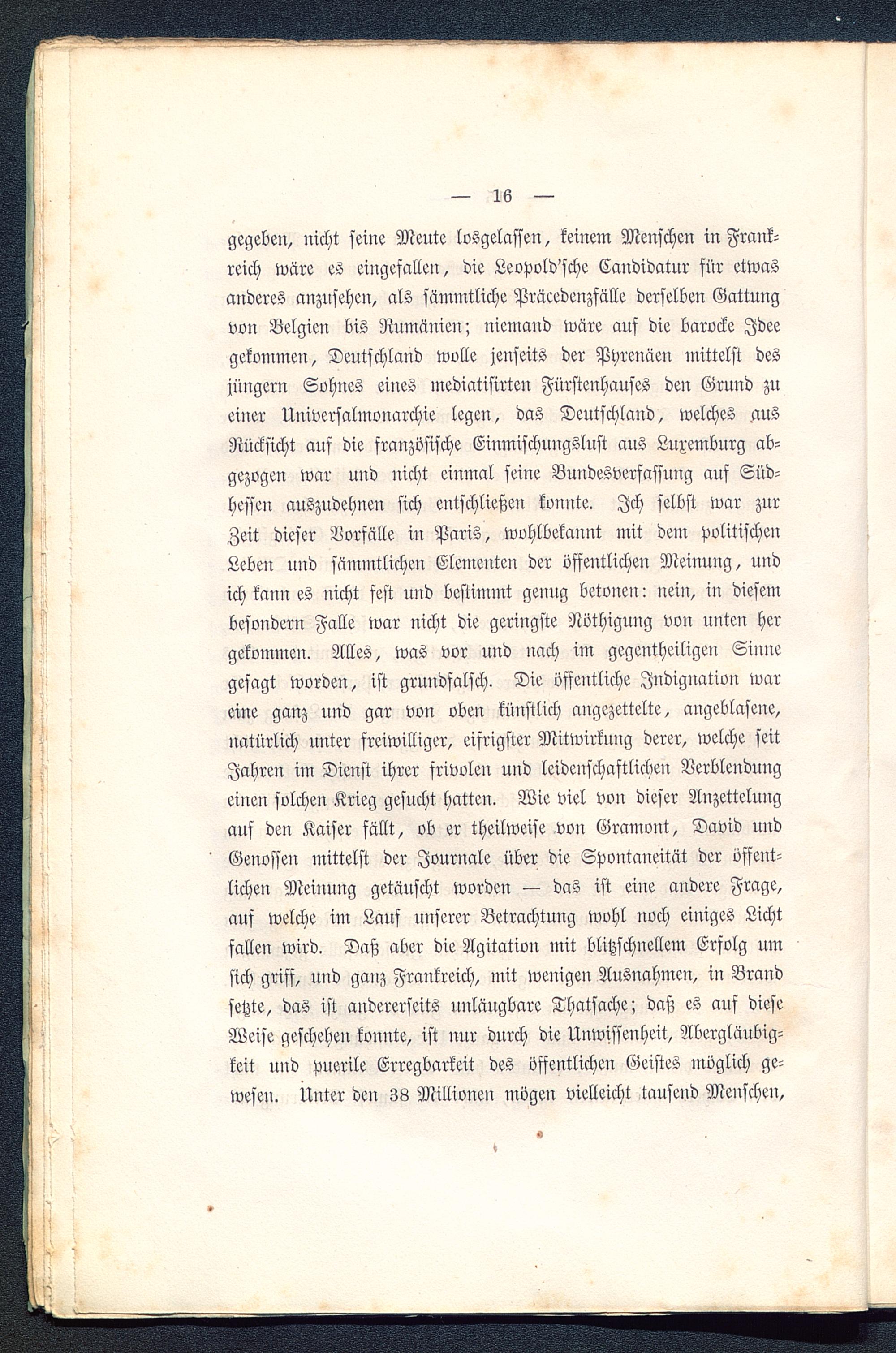gegeben, nicht seine Meute losgelassen, keinem Menschen in Frank-reich wäre es eingefallen, die Leopold'schc Candidatur für etwasanderes anzusehen, als sämmtliche Präcedenzfälle derselben Gattungvon Belgien bis Rumänien ; niemand wäre auf die barocke Ideegekonnnen, Deutschland wolle jenseits der Pyrenäen mittelst desjüngern Sohnes eines inediatisirten Fürstenhauses den Grund zueiner Universalmonarchie legen, das Deutschland , welches ausRücksicht auf die französische Einmischungslust aus Luxemburg ab-gezogen war und nicht einmal seine Bundesverfassung auf Süd-hessen auszudehnen sich entschließen konnte. Ich selbst war zurZeit dieser Vorfälle iu Paris , wohlbekannt mit dem politische«:Leben und sämmtlichen Elementen der öffentlichen Meinung, undich kann es nicht fest und bestimmt genug betonen: nein, in diesembesondern Falle war nicht die geringste Nöthigung vou unten hergekommen. Alles, was vor und nach im gegenthciligcn Sinnegesagt worden, ist grundfalsch. Die öffentliche Indignation wareine ganz und gar von oben künstlich angezettelte, angeblasene,natürlich unter freiwilliger, eifrigster Mitwirknng derer, welche seitJahren im Dienst ihrer srivolen und leidenschaftlichen Verblendungeinen solchen Krieg gesucht hatten. Wie viel von dieser Anzettelungauf den Kaiser fällt, ob er theilweise von Gramont, David undGenossen mittelst der Journale über die Spontaneität der öffent-lichen Meinung getäuscht worden — das ist eine andere Frage,auf welche im Lauf unserer Betrachtung wohl noch einiges Lichtfallen wird. Daß aber die Agitation mit blitzschnellem Erfolg umsich griff, und ganz Frankreich , mit wenigen Ausnahmen, in Brandsetzte, das ist andererseits nuläugbare Thatsache; daß es auf dieseWeise geschehen konnte, ist mir durch die Unwissenheit, Abergläubig-keit und puerile Erregbarkeit des öffentlichen Geistes möglich ge-wesen. Unter den 38 Millionen mögen vielleicht tausend Menschen,