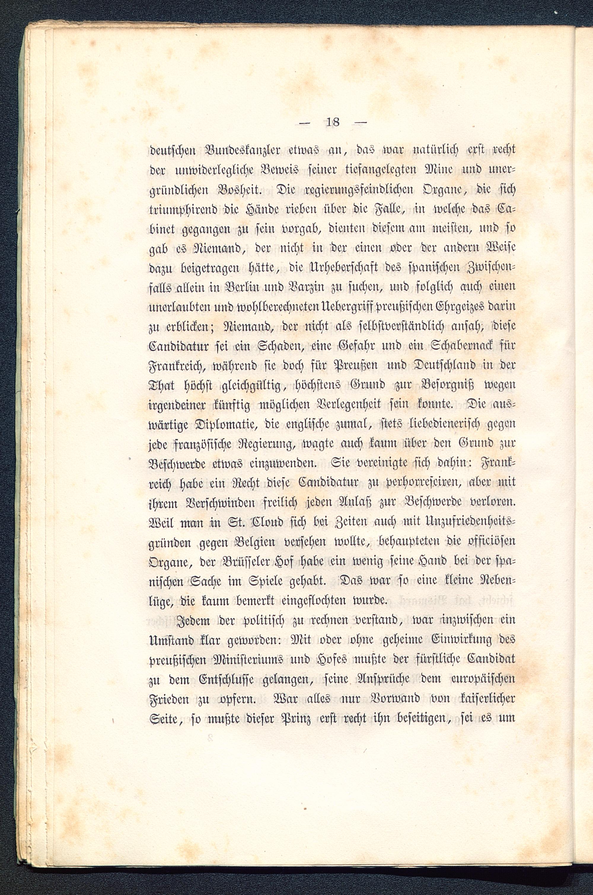 Jedem der politisch zu rechnen verstand, war inzwischen einUmstand klar geworden: Mit oder ohne geheime Einwirkung despreußischen Ministeriums und Hofes mußte der fürstliche Candidatzu dem Entschlüsse gelangen, seine Ansprüche dem europäische!?Frieden zu opfern. War alles nur Vorwand von kaiserlicherSeite, so mußte dieser Prinz erst recht ihn beseitigen, sei es um
