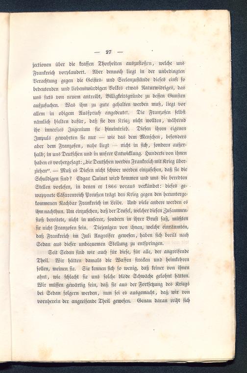 jectionen über die krassen Thorheiten auszustoßen, welche unsFrankreich vorplaudert. Aber dennoch liegt in der unbedingtenVerachtung gegen die Geistes- und Seelenzustände dieses einst sobedeutenden und liebenswürdigen Volkes etwas Naturwidriges, dasuns stets von neuem antreibt, BilligkeitSgrttnde zu dessen Gunstenaufzusnchen. Was ihm zu gute gehalten werden muß, liegt vorallem iu obigem Ausspruch angedeutet. Die Franzosen selbstnämlich hielten dafür, daß sie den Krieg nicht wollten, währendihr innerstes Ingenium sie hineintrieb. Diesen ihren eigenenImpuls gewahrten sie nur — wie das dem Menschen, besondersaber dem Franzosen, nahe liegt — nicht in sich, sondern außer-halb; in uns Deutschen uud in unsrer Entwicklung. Hnnderte von ihnenhaben es vorhergesagt: „die Deutschen werden Frankreich mit Krieg über-ziehen". — Muß es Diesen nicht schwer werden einzusehen, daß sie dieSchuldigen sind? Edgar Quinet wird kommen und uns die beredtenStellen vorlesen, in denen er 1866 voraus verkündet: dieses ge-wappnete Cäsarenreich Preußen trägt den Krieg gegen den herunterge-kommenen Nachbar Frankreich im Leibe. Und viele andere werden esihm nachthun. Um einzusehen, daß der Teufel, welcher diesen Zusammen-stoß bereitete, nicht in unserer, sondern in ihrer Brust saß, müßtensie nicht Franzosen sein. Diejenigen von ihnen, welche einräumten,daß Fraukreich im Juli Angreiser gewesen, haben sich beeilt nachSedan aus dieser unbequemen Stellung zu eutspriugen.