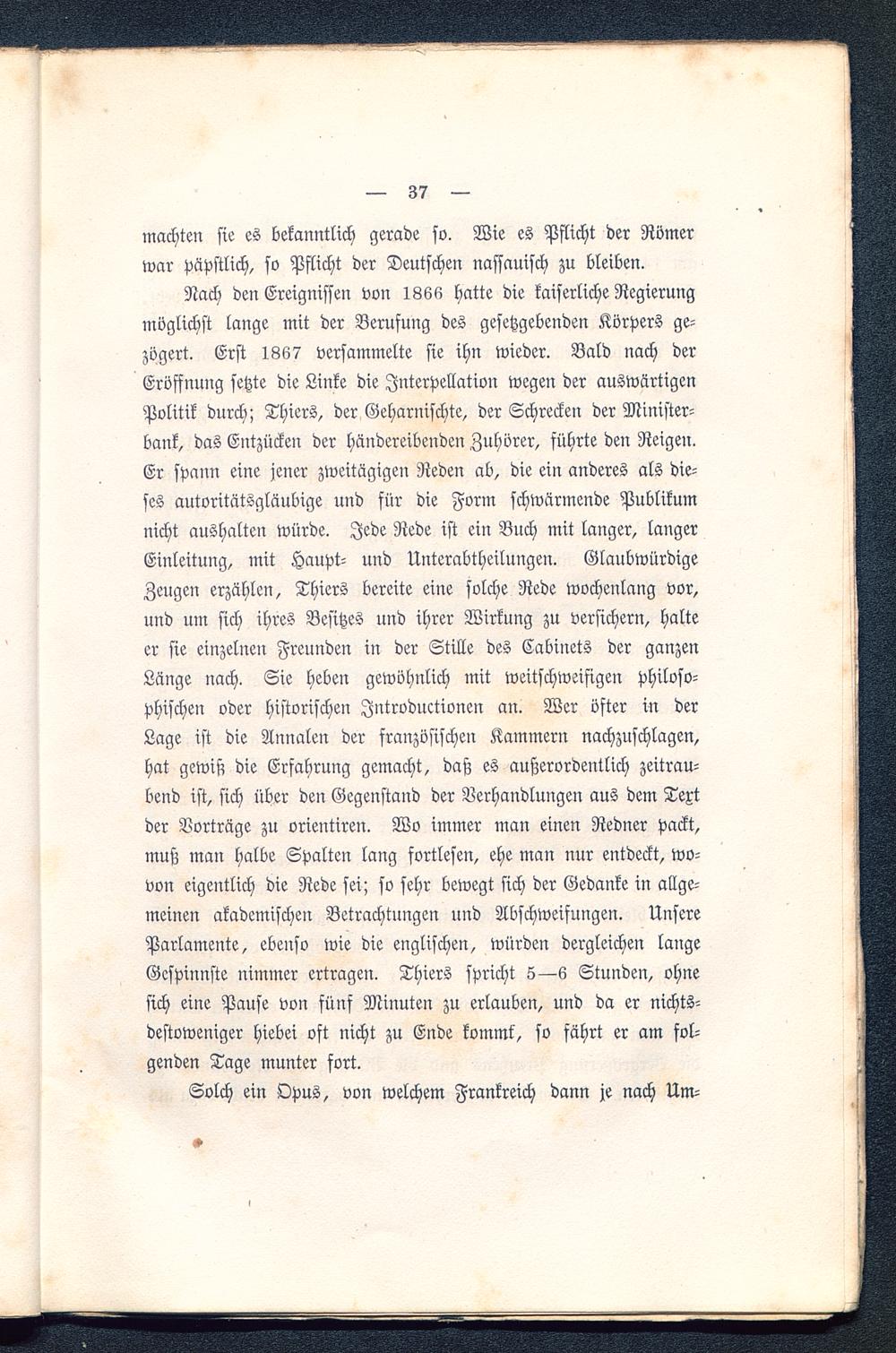 Nach den Ereignissen von 1866 hatte die kaiserliche Regierungmöglichst lange mit der Berufung des gesetzgebenden Körpers ge-zögert. Erst 1867 versammelte sie ihn wieder. Bald nach derEröffnung setzte die Linke die Interpellation wegen der auswärtigenPolitik durch; Thiers, der Geharnischte, der Schrecken der Minister-bank, das Entzücken der händereibenden Zuhörer, führte deu Reigen.Er spann eine jener zweitägigen Reden ab, die ein anderes als die-ses autoritätsgläubige und für die Form schwärmende Publikumnicht aushalten würde. Jede Rede ist ein Buch mit langer, langerEinleitung, mit Haupt- und Unterabtheilungen. GlaubwürdigeZeugen erzählen, Thiers bereite eine solche Rede wochenlang vor,und um sich ihres Besitzes und ihrer Wirkung zu versichern, halteer sie einzelnen Freunden in der Stille des Cabinets der ganzenLänge nach. Sie heben gewöhnlich mit weitschweifigen philoso-phischen oder historischen Jntroductionen an. Wer öfter in derLage ist die Annalen der französischen Kammern nachzuschlagen,hat gewiß die Erfahrung gemacht, daß es außerordentlich zeitrau-bend ist, sich über den Gegenstand der Verhandlungen aus dem Textder Vorträge zu orientiren. Wo immer man einen Redner packt,muß man halbe Spalten lang fortlesen, ehe man nur entdeckt, wo-von eigentlich die Rede sei; so sehr bewegt sich der Gedanke in allge-meinen akademische«: Betrachtungen und Abschweifungen. UnsereParlamente, ebenso wie die englischen, würden dergleichen langeGespinnste nimmer ertragen. Thiers spricht 5—6 Stunden, ohnesich eine Pause von fünf Minuten zu erlauben, und da er nichts-destoweniger hiebei oft nicht zu Ende kommt', so fährt er am fol-genden Tage munter fort.