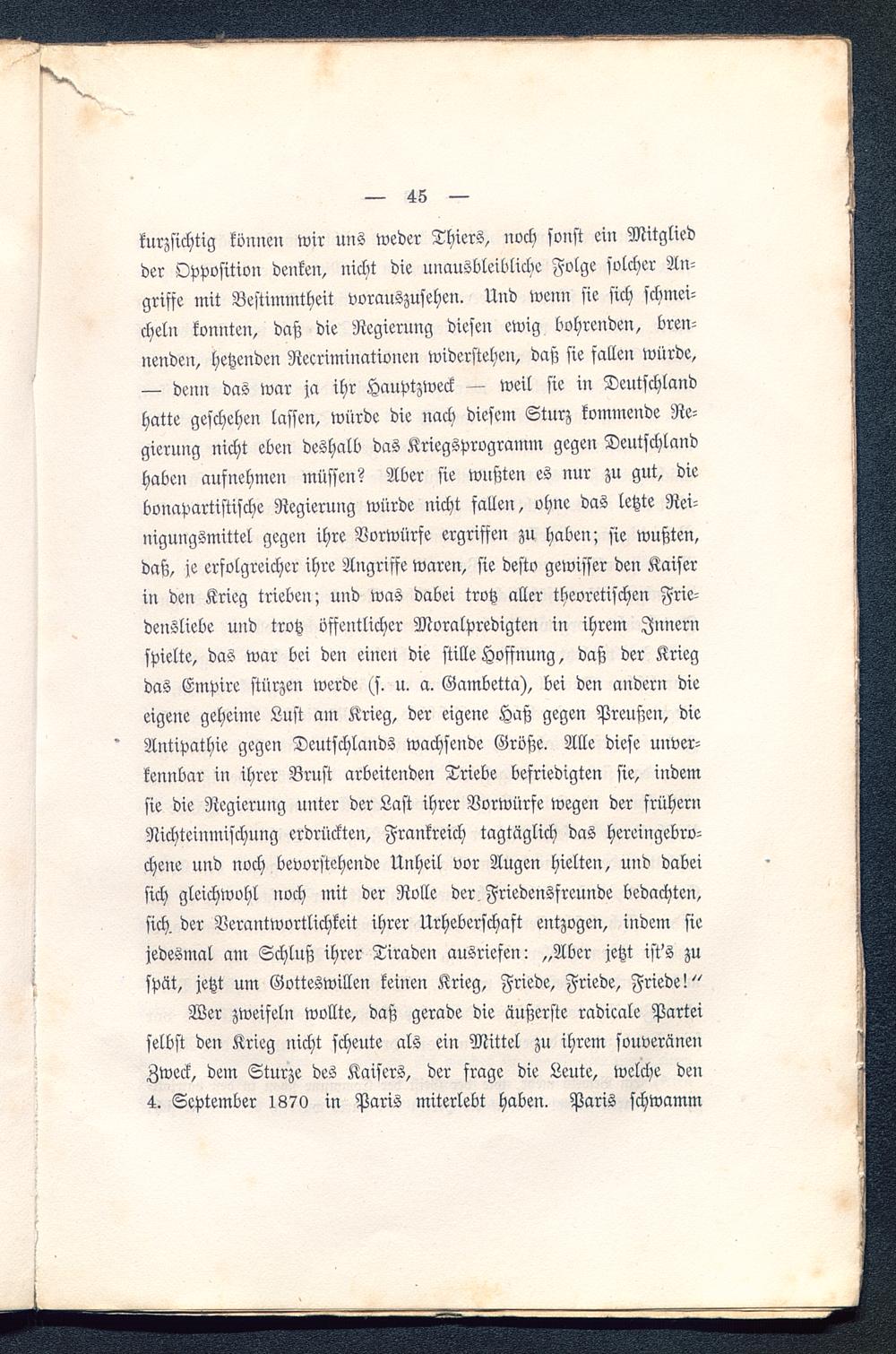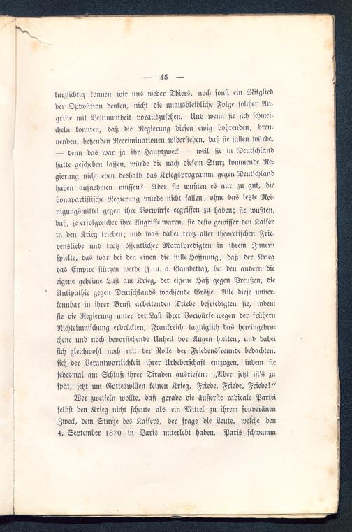 Wer zweifeln wollte, daß gerade die äußerste radicale Parteiselbst den Krieg nicht scheute als ein Mittel zu ihrem souveränenZweck, dem Sturze des Kaisers, der frage die Leute, welche den4. September 1870 in Paris miterlebt haben. Paris schwamm
