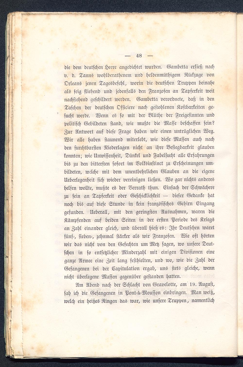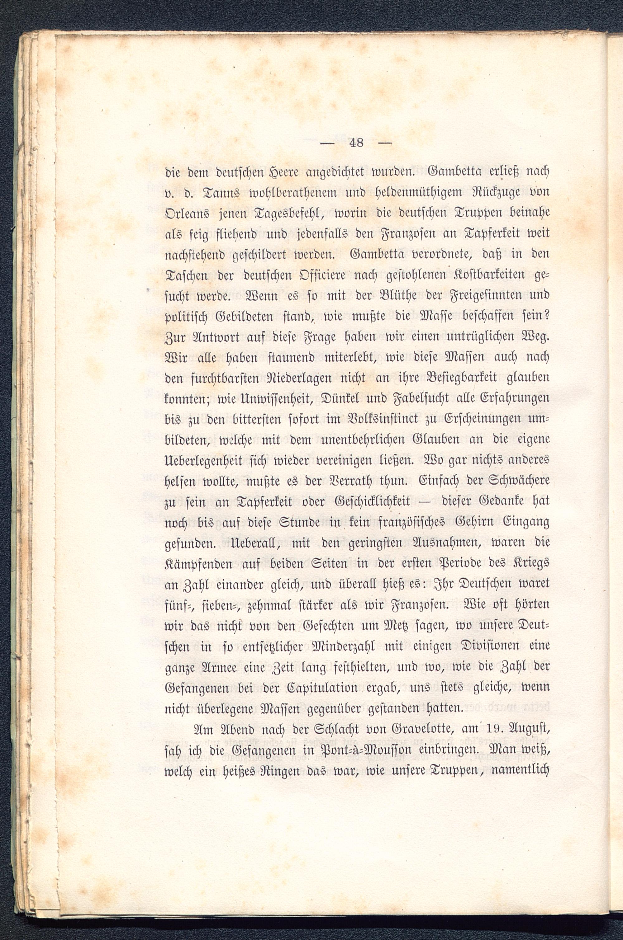 Am Abend nach der Schlacht von Gravelotte, am 19. August,sah ich die Gefangenen in Pont-a.-Mousson einbringen. Man weiß,welch ein heißes Ringen das war, wie unsere Truppen, namentlich