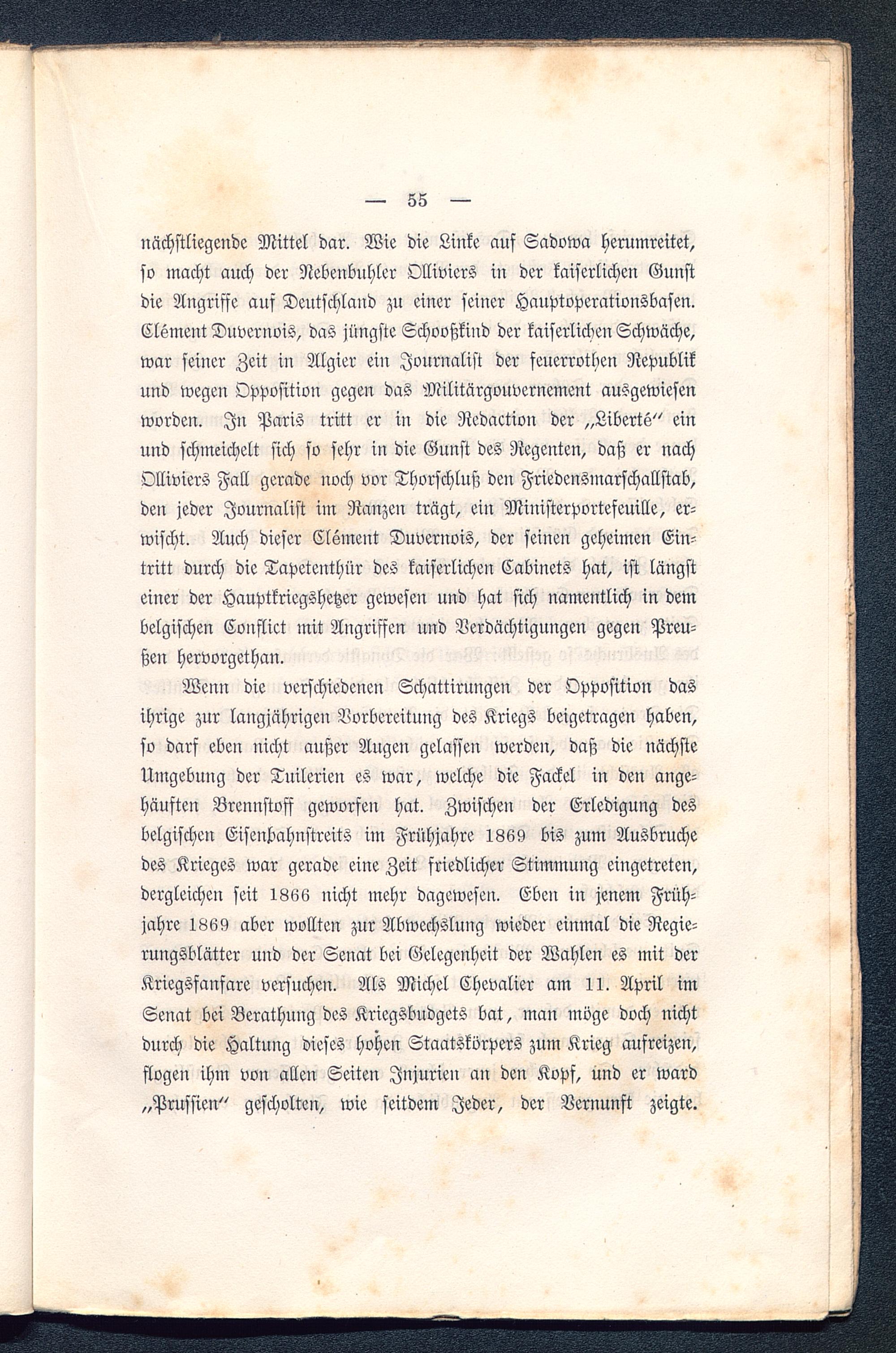 Wenn die verschiedenen Schattirungen der Opposition dasihrige zur langjährigen Vorbereitung des Kriegs beigetragen haben,so darf eben nicht außer Augen gelassen werden, daß die nächsteUmgebung der Tuilerien es war, welche die Fackel in den ange-häuften Brennstoff geworfen hat. Zwischen der Erledigung desbelgischen Eisenbahnstreits im Frühjahre 1869 bis zum Ausbruchedes Krieges war gerade eine Zeit friedlicher Stimmung eingetreten,dergleichen seit 1866 nicht mehr dagewesen. Eben in jenem Früh-jahre 1869 aber wollten zur Abwechslung wieder einmal die Regie-rungsblätter uud der Senat bei Gelegenheit der Wahlen es mit derKriegsfanfare versuchen. Als Michel Chevalier am 11. April imSenat bei Berathung des Kriegsbudgets bat, man möge doch nichtdurch die Haltung dieses hohen Staatskörpers zum Krieg aufreizen,flogen ihm von allen Seiten Injurien an den Kopf, und er ward„Prussien" gescholten, wie seitdem Jeder, der Vernunft zeigte.
