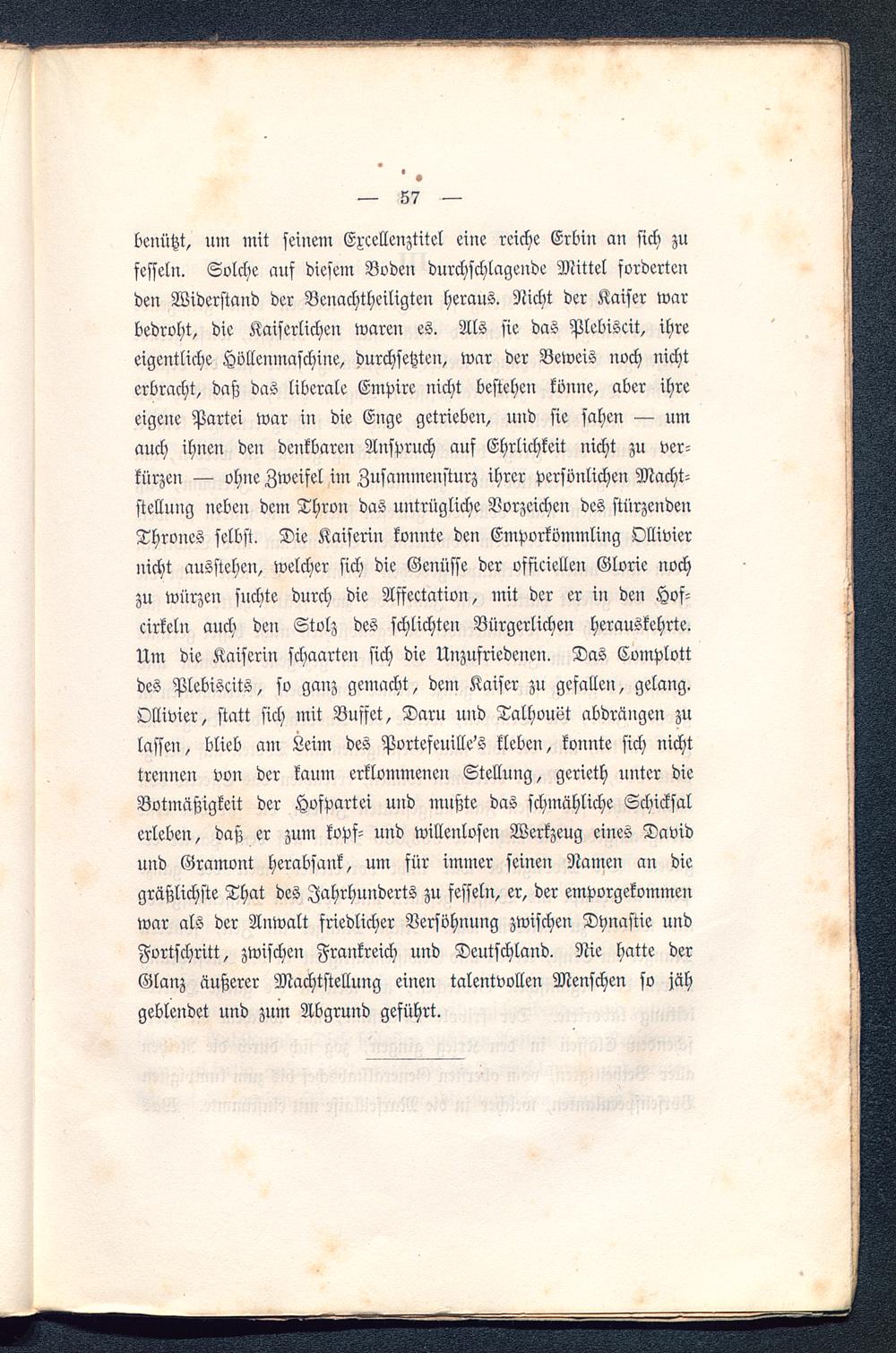 benützt, um mit seinem Excellenztitel eine reiche Erbin an sich zufesseln. Solche auf diesem Boden durchschlagende Mittel fordertenden Widerstand der Benachtheiligten heraus. Nicht der Kaiser warbedroht, die Kaiserlichen waren es. Als sie das Plebiscit, ihreeigentliche Höllenmaschine, durchsetzten, war der Beweis noch nichterbracht, daß das liberale Empire nicht bestehen könne, aber ihreeigene Partei war in die Enge getrieben, und sie sahen — umauch ihnen den denkbaren Anspruch auf Ehrlichkeit nicht zu ver-kürzen — ohne Zweifel im Zusammensturz ihrer persönlichen Macht-stellung neben dem Thron das untrügliche Vorzeichen des stürzendenThrones selbst. Die Kaiserin konnte den Emporkömmling Olliviernicht ausstehen, welcher sich die Genüsse der vfficiellen Glorie nochzu würzen suchte durch die Affectation, mit der er in den Hof-cirkeln auch den Stolz des schlichten Bürgerlichen herauskehrte.Um die Kaiserin schaarten sich die Unzufriedenen. Das Cvmplottdes Plebiscits, so ganz gemacht, dem Kaiser zu gefallen, gelang.Ollivier, statt sich mit Büffet, Daru und Talhoust abdrängen zulassen, blieb am Leim des Portefeuille's kleben, konnte sich nichttrennen von der kaum erklommenen Stellung, gerieth unter dieBotmäßigkeit der Hofpartei uud mußte das schmähliche Schicksalerleben, daß er zum köpf- und willenlosen Werkzeug eines Davidund Gramont herabsank, um für immer seinen Namen an diegräßlichste That des Jahrhunderts zu fesseln, er, der emporgekommenwar als der Anwalt friedlicher Versöhnung zwischen Dynastie undFortschritt, zwischen Frankreich und Deutschland . Nie hatte derGlanz äußerer Machtstellung einen talentvollen Menschen so jähgeblendet und zum Abgrund geführt.