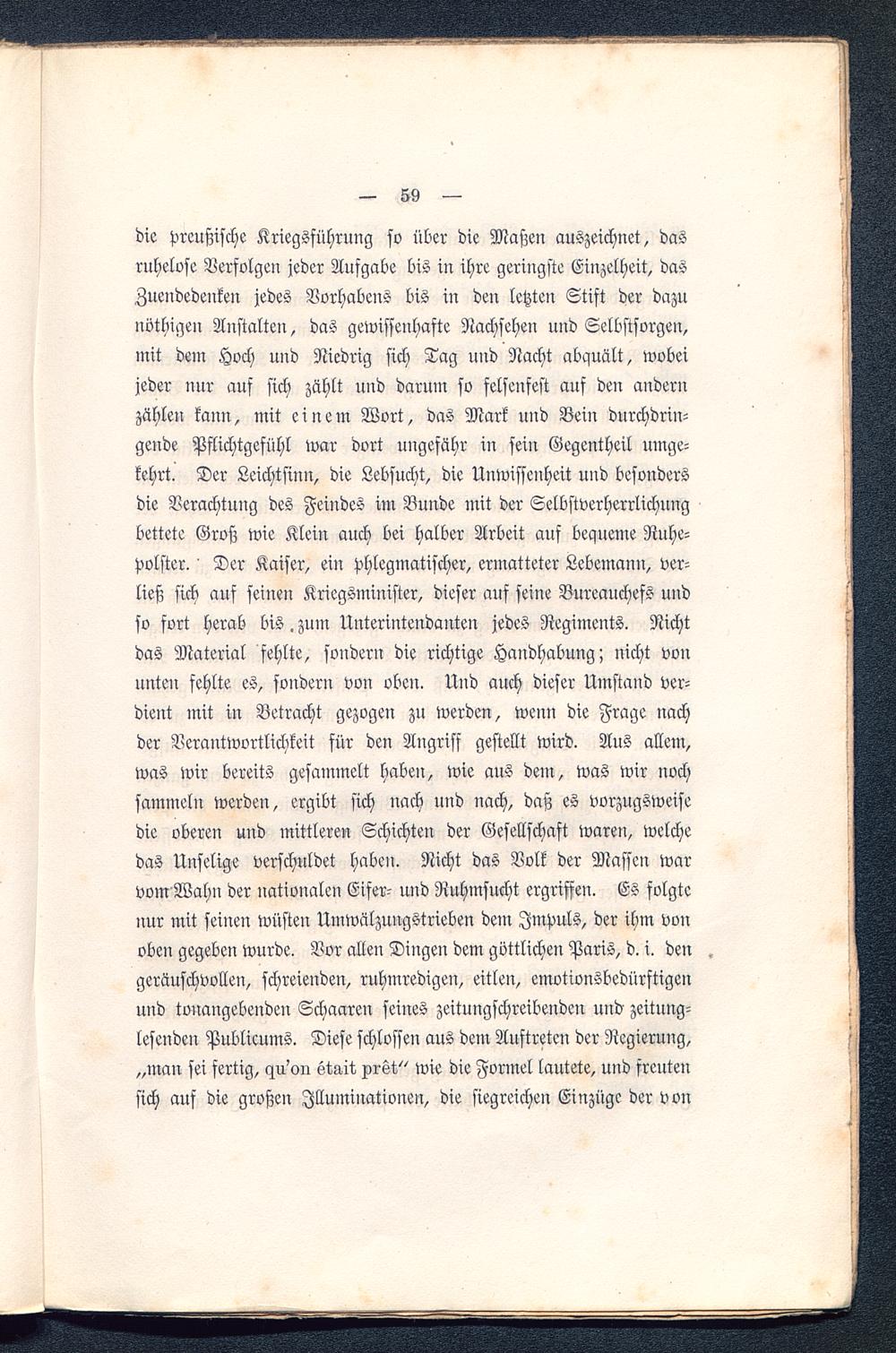 die preußische Kriegsführung so über die Maßeu auszeichnet, dasruhelose Verfolgen jeder Aufgabe bis in ihre geringste Einzelheit, dasZuendedenken jedes Vorhabens bis in den letzten Stift der dazunöthigen Anstalten, das gewissenhafte Nachsehen und Selbstsorgen,mit dem Hoch und Niedrig sich Tag und Nacht abquält, wobeijeder nur auf sich zählt und darum so felsenfest auf den andernzählen kann, mit einem Wort, das Mark und Bein durchdrin-gende Pflichtgefühl war dort ungefähr in sein Gegentheil umge-kehrt. Der Leichtsinn, die Lebsucht, die Unwissenheit und besondersdie Verachtung des Feindes im Bunde mit der Selbstverherrlichungbettete Groß wie Klein auch bei halber Arbeit auf bequeme Ruhe-polster. ' Der Kaiser, ein phlegmatischer, ermatteter Lebemann, ver-ließ sich auf seinen Kriegsminister, dieser auf seine Bureauchefs undso fort herab bis. zum Unterintendanten jedes Regiments. Nichtdas Material fehlte, sondern die richtige Handhabung; nicht vonunten fehlte es, sondern von oben. Und auch dieser Umstand ver-dient mit in Betracht gezogen zu werden, wenn die Frage nachder Verantwortlichkeit für den Angriff gestellt wird. Aus allem,was wir bereits gesammelt haben, wie aus dem, was wir nochsammeln werden, ergibt sich nach und nach, daß es vorzugsweisedie oberen und mittleren Schichten der Gesellschaft waren, welchedas Unselige verschuldet haben. Nicht das Volk der Massen warvom Wahn der nationalen Eifer- und Ruhmsucht ergriffen. Es folgtenur mit seinen wüsten Umwälzungstrieben dem Impuls, der ihm vonoben gegeben wurde. Vor allen Dingen dem göttlichen Paris , d. i. den .geräuschvollen, schreienden, ruhmredigen, eitlen, emotionsbedürftigenund tonangebenden Schaaren feines zeitungschreibenden und zeitung-lesenden Publieums. Diese schloffen aus dem Auftreten der Regierung,„man sei fertig, ^u.'on statt xröt," wie die Formel lautete, und freutensich auf die großen Illuminationen, die siegreichen Einzüge der von