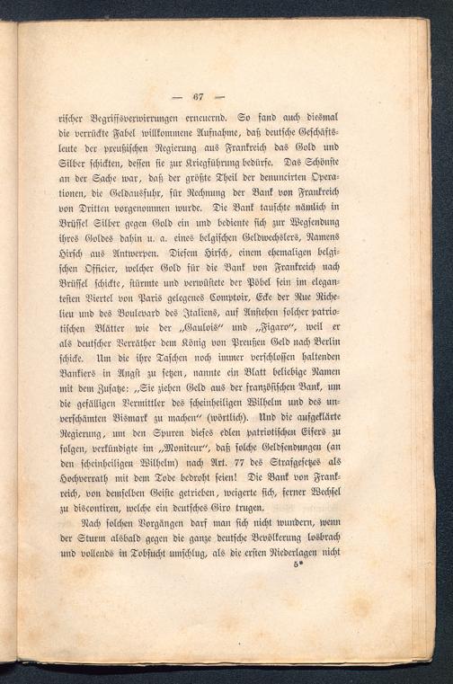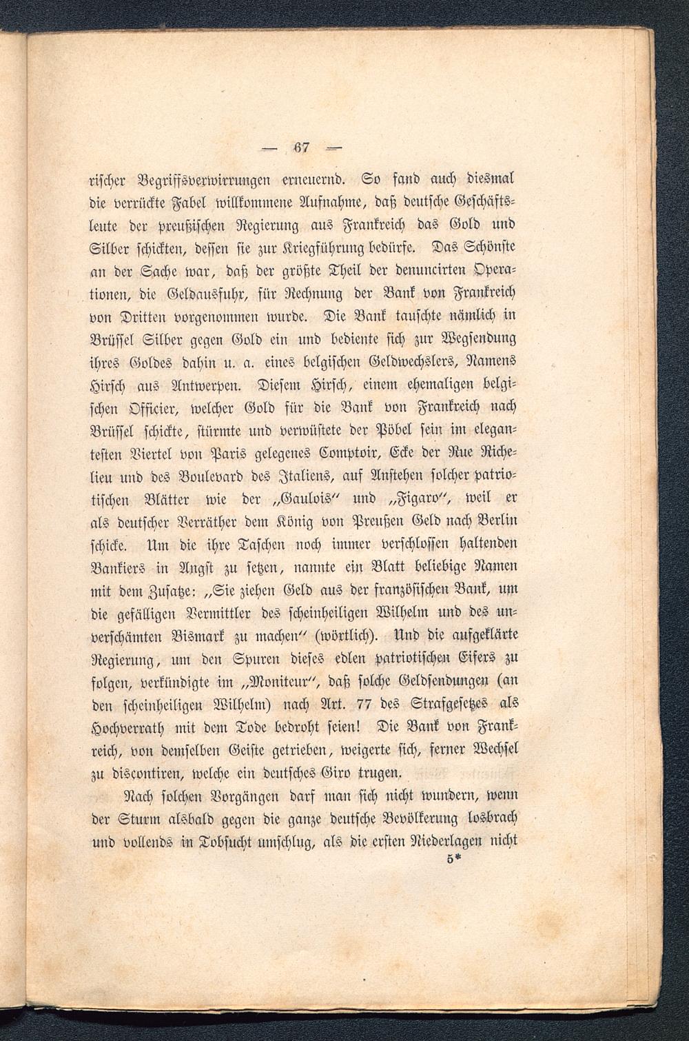rischer Begriffsverwirrungen erneuernd. So fand auch diesmaldie verrückte Fabel willkommene Aufuahme, daß deutsche Geschäfts-leute der preußischen Regierung aus Frankreich das Gold undSilber schickten, dessen sie zur Kriegführung bedürfe. Das Schönstean der Sache war, daß der größte Theil der denuucirten Opera-tionen, die Geldausfuhr, für Rechnung der Bank von Frankreich von Dritten vorgenommen wurde. Die Bank tauschte nämlich inBrüssel Silber gegen Gold ein und bediente sich zur Wegsendungihres Goldes dahin u. a. eines belgischen Geldwechslers, NamensHirsch aus Antwerpen . Diesem Hirsch, einem ehemaligen belgi-schen Officier, welcher Gold für die Bank von Frankreich nachBrüssel schickte, stürmte und verwüstete der Pöbel sein im elegan-testen Viertel von Paris gelegenes Comptoir, Ecke der Rue Riche-lieu und des Boulevard des Italiens, auf Anstehen solcher patrio-tischen Blätter wie der „Gaulois" und „Figaro", weil erals deutscher Verräther dem König von Preußen Geld nach Berlin schicke. Um die ihre Taschen noch immer verschlossen haltendenBankiers in Angst zu setzen, uannte ein Blatt beliebige Namenmit dem Zusätze: „Sie ziehen Geld aus der französischen Bank, umdie gefälligen Vermittler des scheinheiligen Wilhelm und des un-verschämten Bismark zu machen" (wörtlich). Und die aufgeklärteRegierung, um den Spnren dieses edlen patriotischen Eifers zufolgen, verkündigte im „Moniteur", daß solche Geldsendimgeu (anden scheinheiligen Wilhelm) nach Art. 77 des Strafgesetzes alsHochverrath mit dem Tode bedroht seien! Die Bank von Frank-reich , von demselben Geiste getrieben, weigerte sich, ferner Wechselzu discontiren, welche ein deutsches Giro trugen.